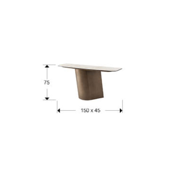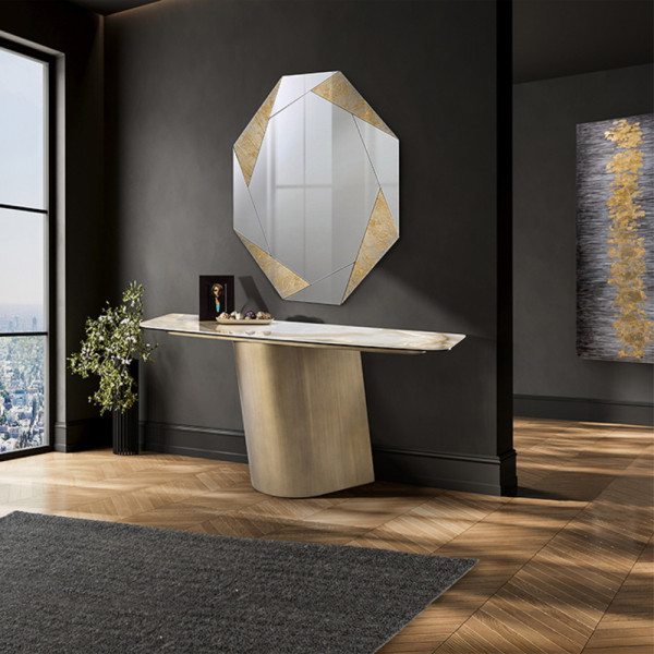 Consola de 240cm realizada en metal acabado latón cepillado con tapa de porcelánico/cristal acabado mármol veteado