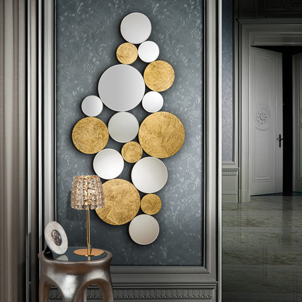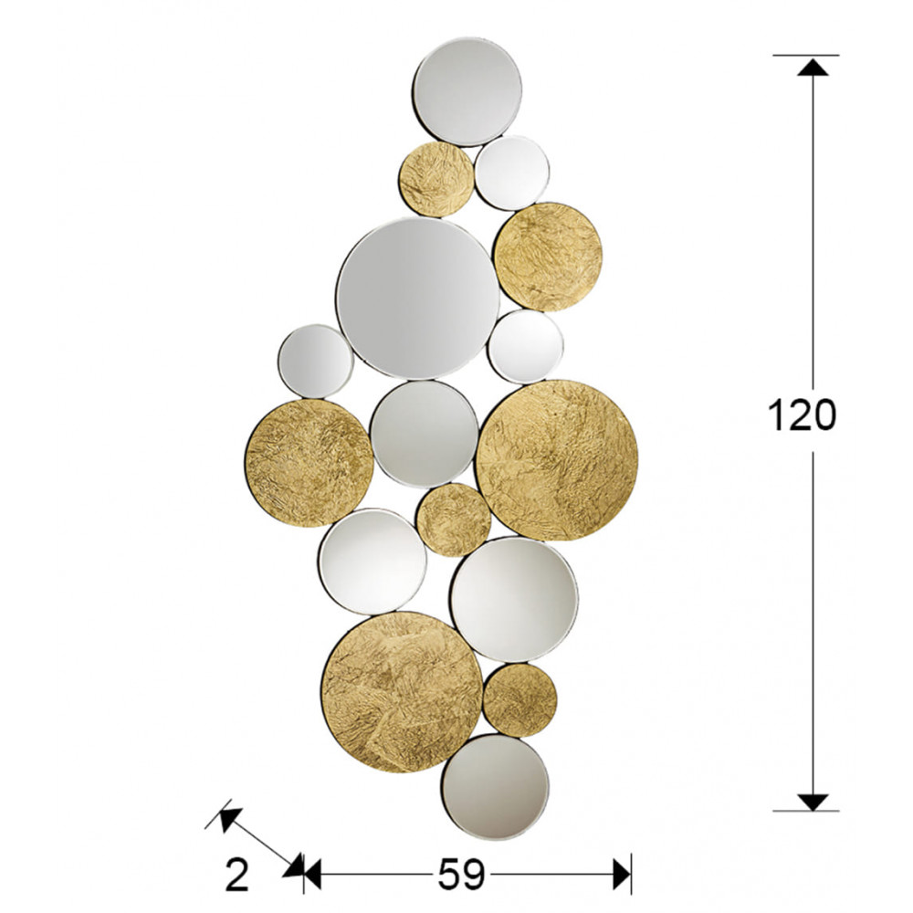 CIRZE Espejo formado por círculos de lunas y cristales con fondo en pan de oro, biselados. Trasera de DM lacado en negro. Preparado para colgar en posición horizontal o vertical.