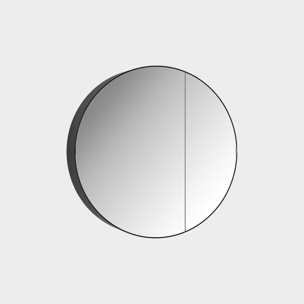 Espejo negro mate redondo sin luz de Ø79cm con almacenaje oculto, 2 sentidos de instalación posibles.