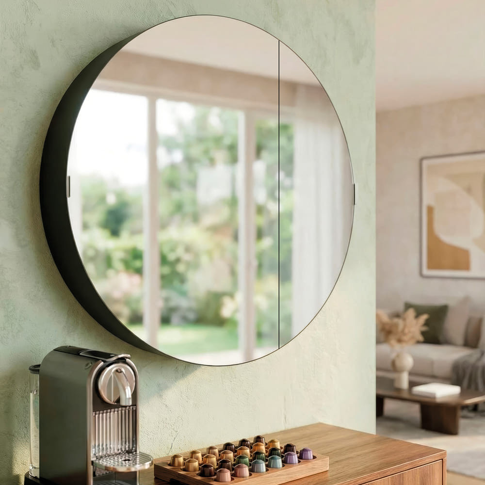 El espejo Canet es la síntesis perfecta entre diseño minimalista y funcionalidad práctica. A primera vista, se presenta como un elegante espejo circular de gran formato con un sofisticado marco en negro mate, ideal para aportar profundidad y estilo a cualquier estancia. Sin embargo, su verdadero valor reside en su capacidad de organización.