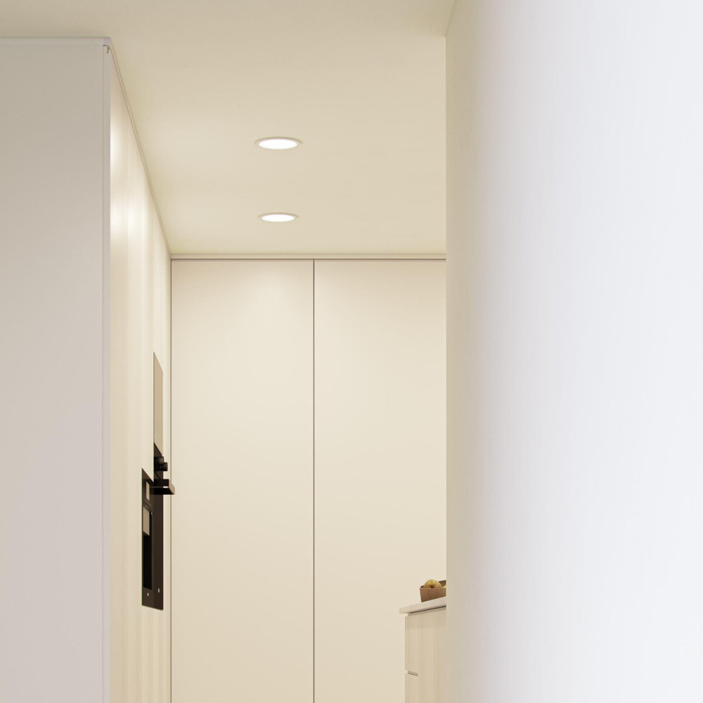 La luminaria Noi, empotrada en el techo, muestra un diseño minimalista y una luz apropiada, ya que al tener opción a ser dimmable, es capaz de iluminar una sala entera con diversas intensidades lumínicas. Además, ofrece dos temperaturas de color de 3.000K y 4.000K que ambientan de forma distinta la estancia.