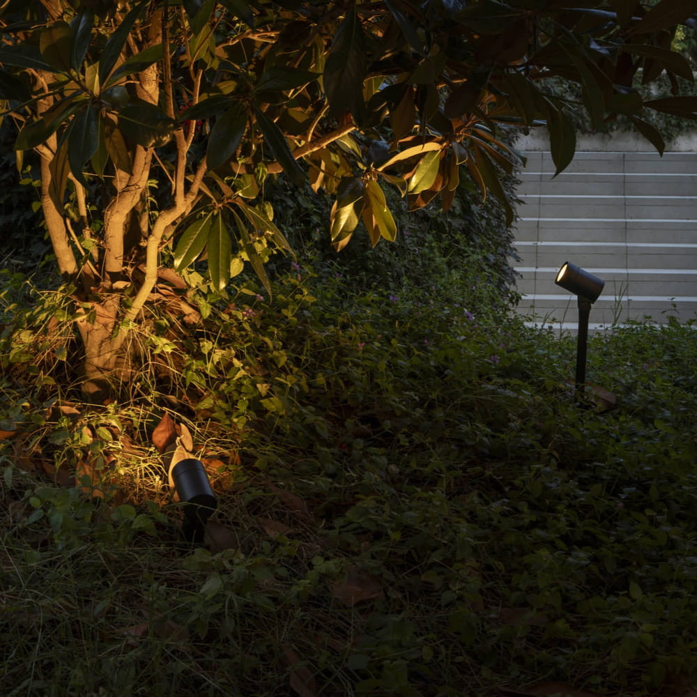 Proyector-estaca LED negro IP65 para exteriores, fabricado en aluminio, funciona a 24V. 2,5W, 3000K, 144lm, CRI90, 30º