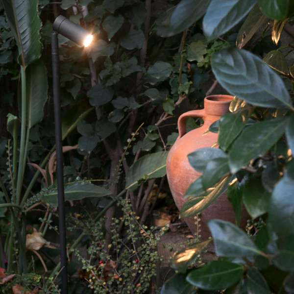 Estaca LED moderna con un estilizado diseño para iluminación de jardín, fabricada en aluminio.