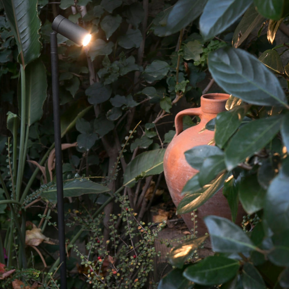 Estaca LED moderna con un estilizado diseño para iluminación de jardín, fabricada en aluminio y PMMA. La fuente de iluminación es SMD LED 6W 2700K 450Lm 40° CRI>80. SETH es una estaca ideal para la iluminación decorativa que realza elementos como objetos, árboles o plantas.