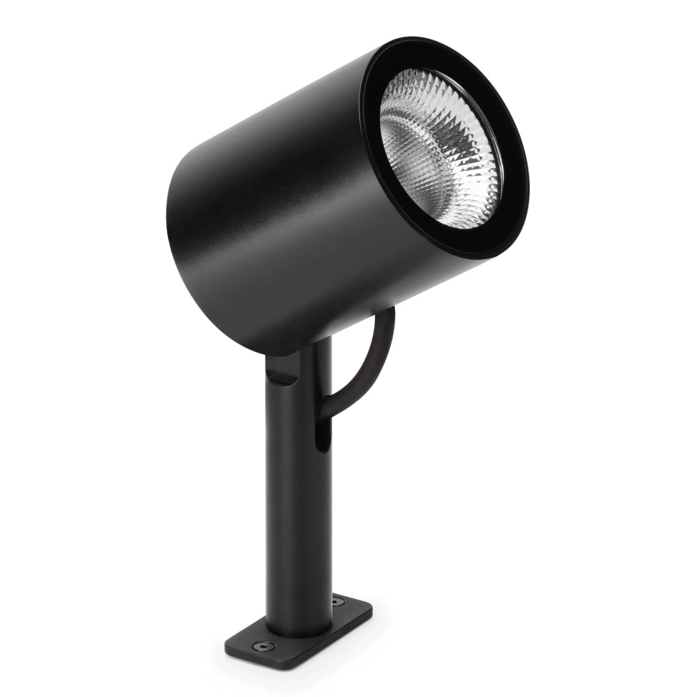 Proyector LED con estaca fabricado en aluminio anodizado, acabado negro. 20W, 4 ópticas y 4 colores de luz a elegir