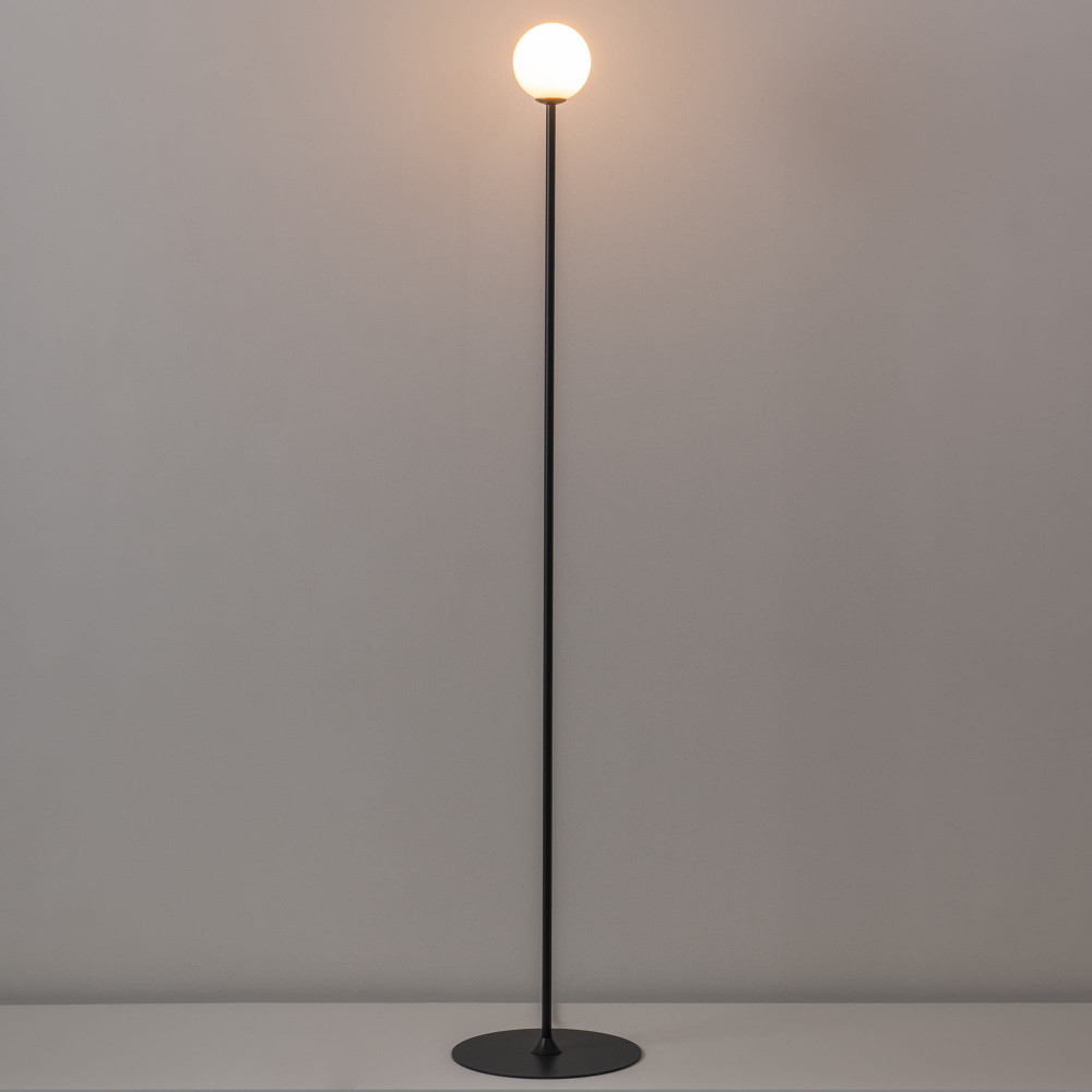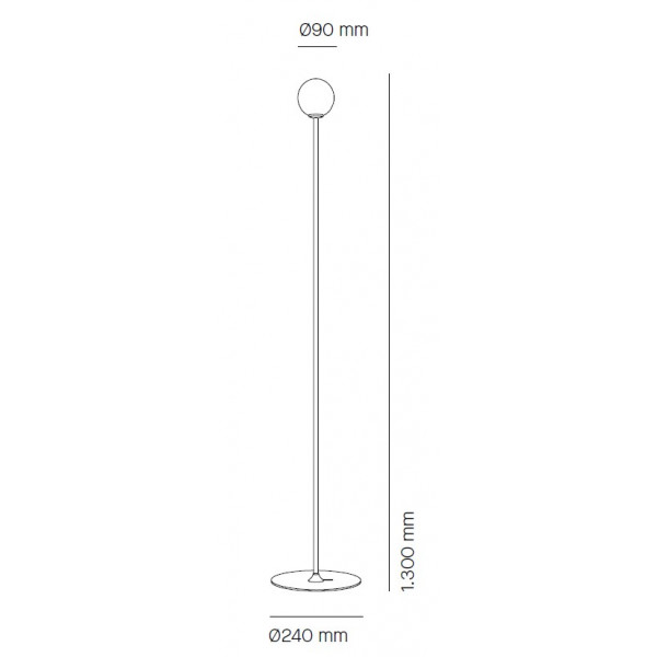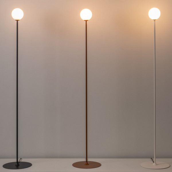 Vidrio soplado opal brillo con soporte inyectado en policarbonato, acabados en lacados visón (NCS S 2005-Y10R), gris marengo (RAL 7016) y cobre metalizado (D2525 Tanami Sablé). Soporte del vidrio que le une con el tubo de acero, en policarbonato inyectado. Base en acero de 3 mm de grosor. Dimmer aéreo incorporado en el cableado.