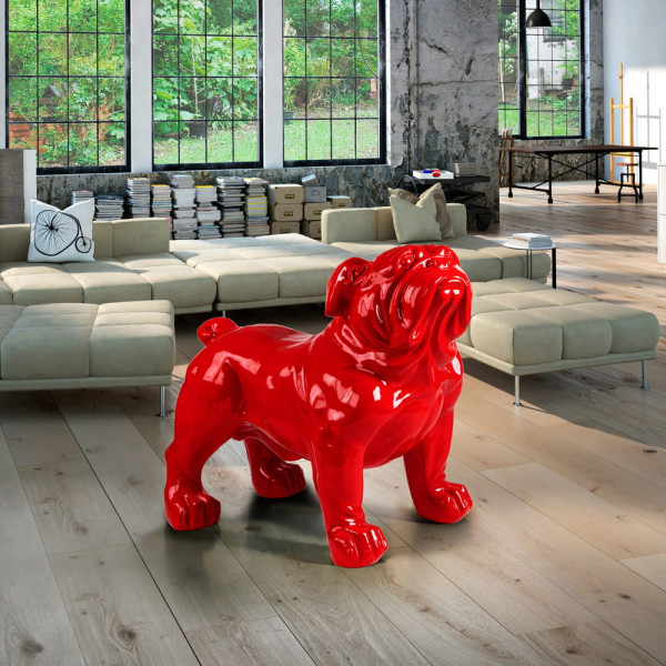 Figura de perro de gran tamaño, raza Bulldog, realizada en fibra de vidrio y poliester. Válido para exterior. Decoración: Pintura rojo brillo.