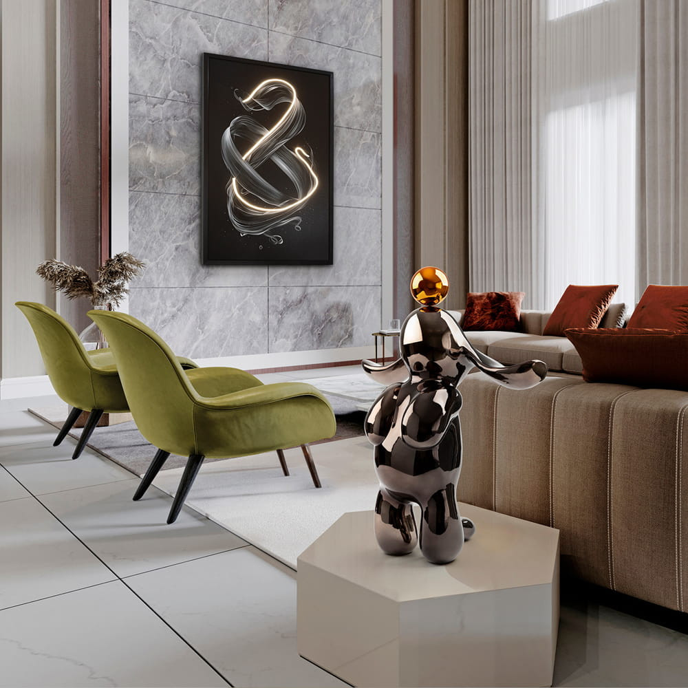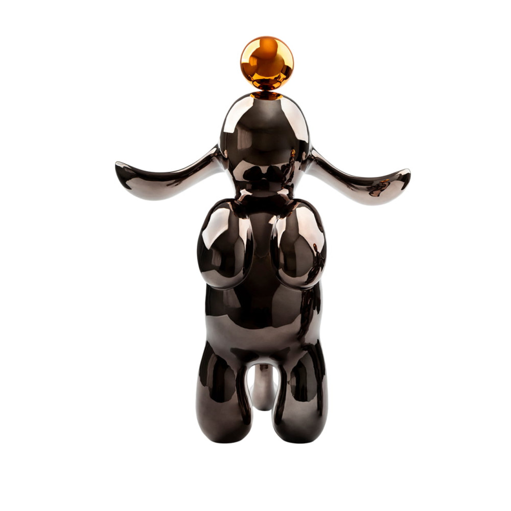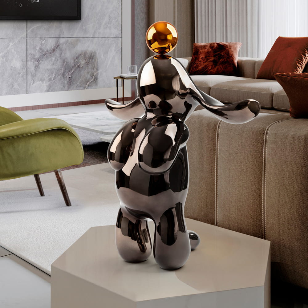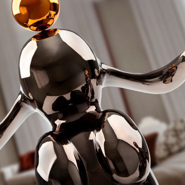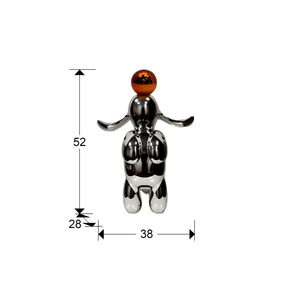 Figura de conejo con formas redondeadas, 38x52 cm. Realizada en resina, acabado metalizado en gris plomo y naranja.