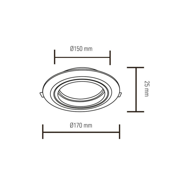 Dimensiones: Diámetro exterior de 170 mm y altura de 25 mm. Requiere un orificio de corte de 150 mm de diámetro para su instalación.