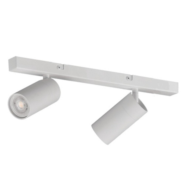 Regleta de dos luces disponible en varios acabados mate que admite bombilla GU10 (no incluida). Focos orientables 360º y basculante 90º.