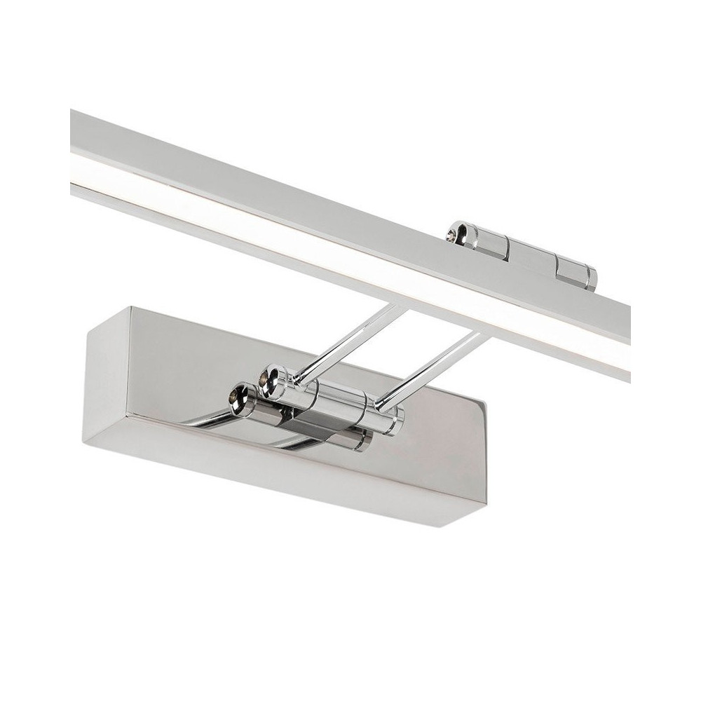 Iluminacuadros LED con posición regulable. Podemos modificar la distancia a la que ilumina y el grado de inclinación. Acabado en cromo con remates en cromo.