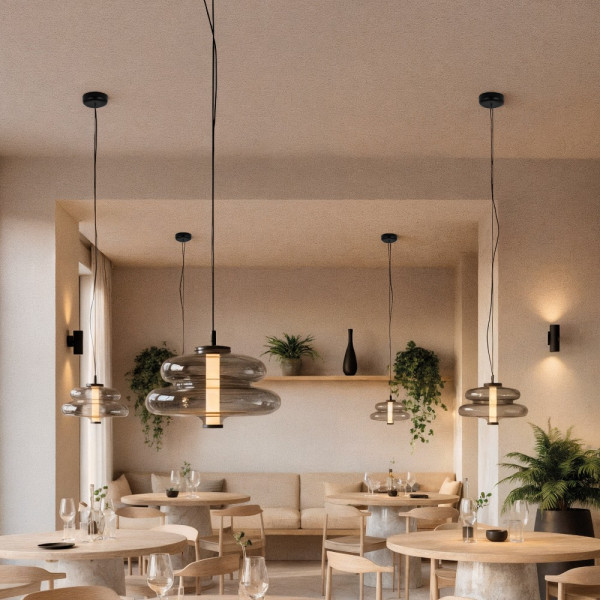 Colgante de techo de doble tulipa fabricado en cristal y aluminio disponible en acabados ambar y smoke fumé, dos tamaños y versión aplique y colgante. Fuente de luz led de 9,5W 2700k 885lm.