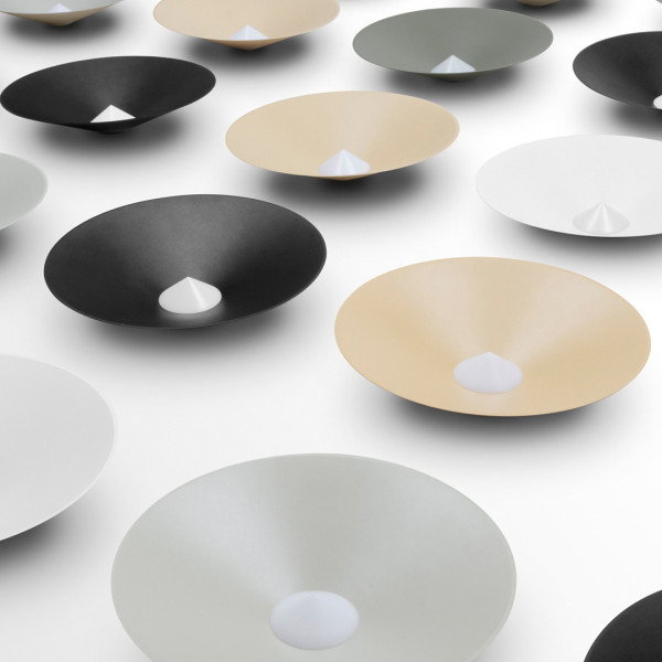 La fuente lumínica queda casi oculta en la pantalla y se dirige al plano inferior con un caudal atenuado gracias a un difusor en forma de cono invertido. Encendida, el color del interior cambia y acentúa esta forma que evoca un sistema dunar.