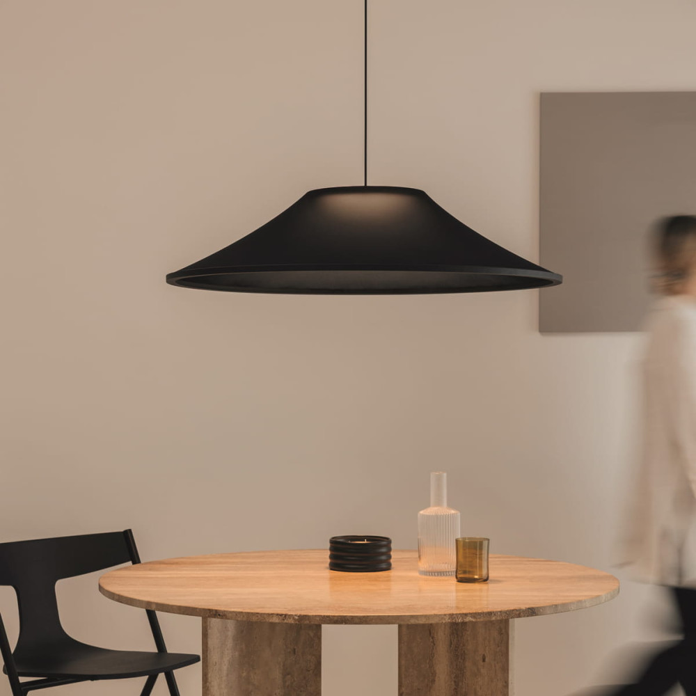 Colgante de techo textil negro LED con base de superficie y dos opciones de control. 7,2W, 2700K, 1150lm, 78º