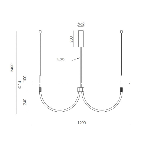 Lámpara colgante doble tipo arco con tiras LED de silicona opal, disponible en oro envejecido o negro mate.