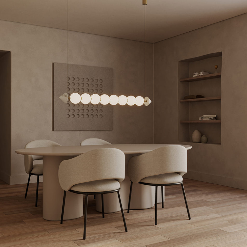 La colección Soko redefine la iluminación decorativa con un diseño escultórico y sofisticado. Compuesta por dos apliques de pared, una lámpara de pie y una lámpara colgante, cada pieza combina con maestría la solidez del metal, la elegancia atemporal del mármol y la delicadeza de los difusores de cristal esféricos.