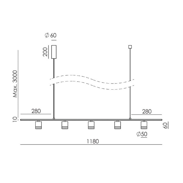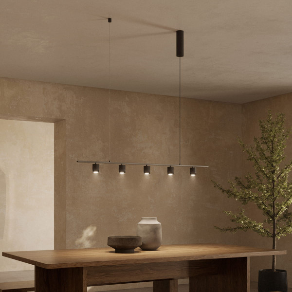 Colgante lineal de 5 luces: perfecto para comedores, cocinas o espacios amplios que buscan una iluminación equilibrada y contemporánea.
