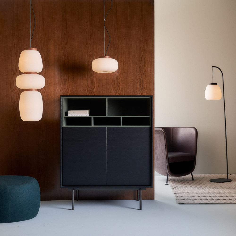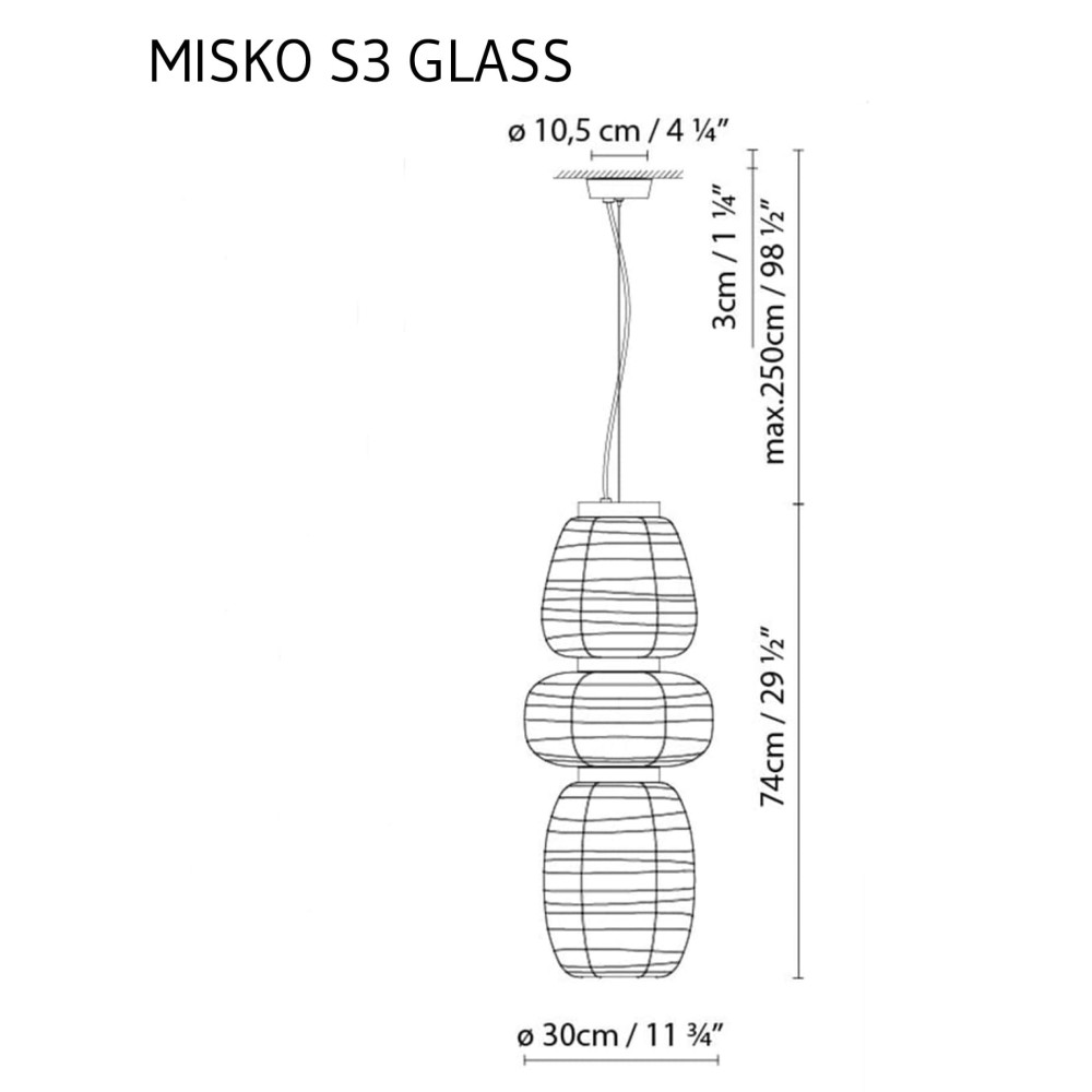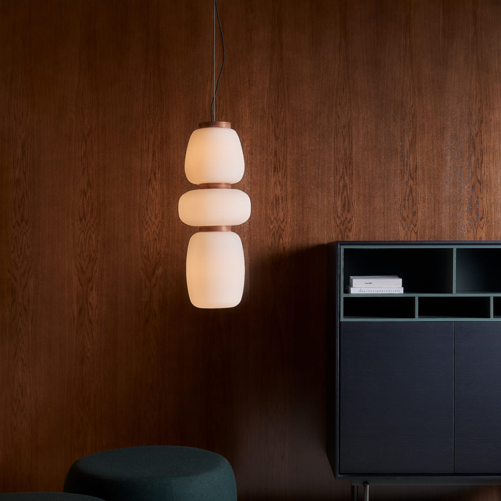 Luminaria de suspensión unitaria o múltiple, de inspiración japonesa. Todas ellas se crean a partir de un disco que alberga una fuente de luz (E27). Este disco está disponible en acabado de nogal natural o pintado en negro mate, y da soporte al difusor de vidrio soplado texturado, que presenta un acabado blanco mate opal. Las suspensiones unitarias tienen un único difusor de vidrio, y están disponibles en tres tamaños (S15, S25 y S35). Las suspensiones múltiples permiten diferentes composiciones, ya que pueden estar formadas por dos difusores de vidrio (S2 Glass), o tres (S3 Glass), a elección del cliente. Cable textil negro.