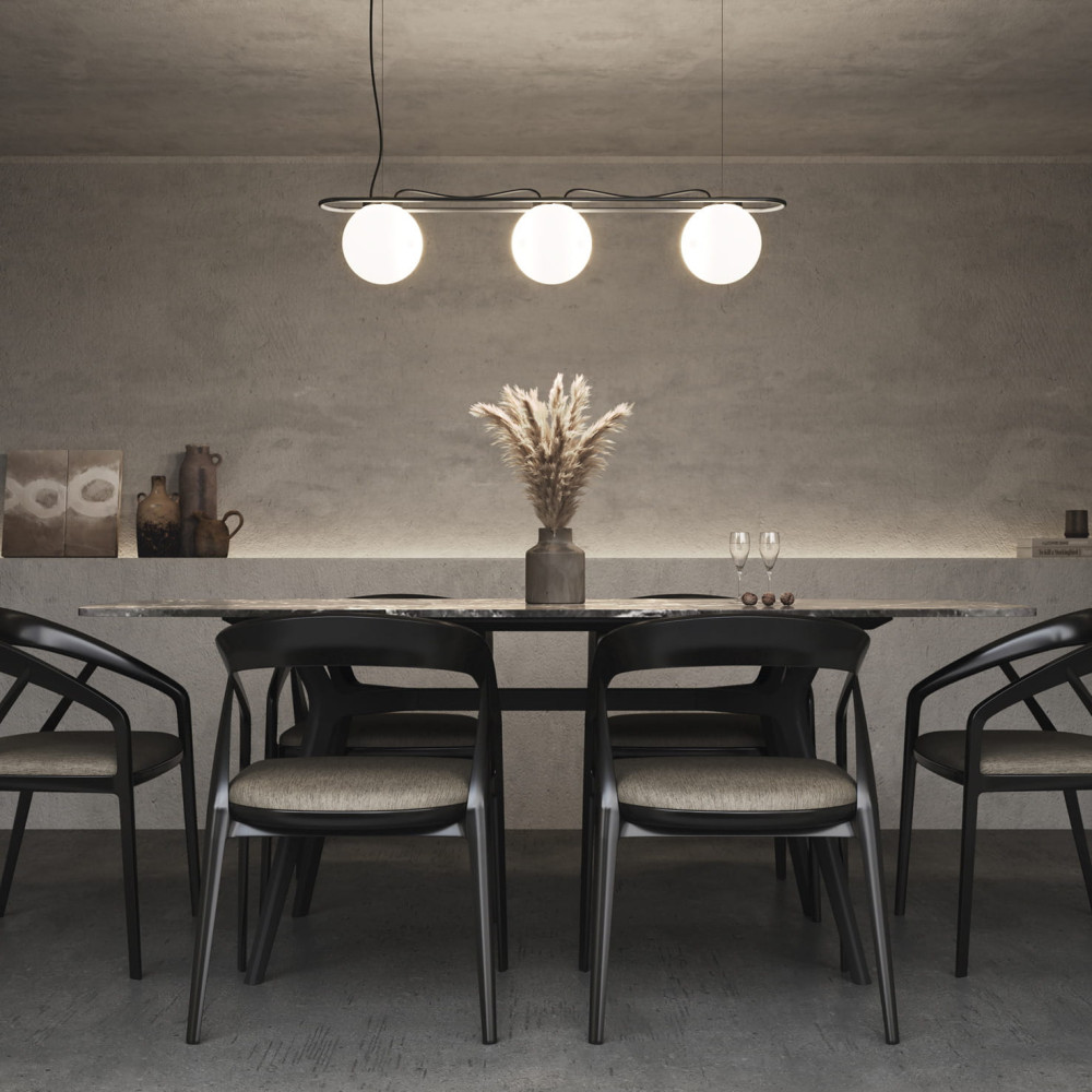 Además, Oxy cuenta con modelos de suspensión dobles y triples montados sobre estructuras de corte industrial en acabado negro. Este año, estos modelos incorporan como novedad la bola en imitación alabastro, que se suma a la opción original en cristal opal.