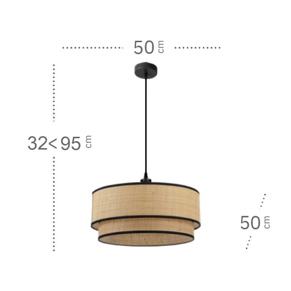 Colgante serie ROQUE de color NATURAL/NEGRO de 50 centímetros de diámetro. Posee dos portalámparas E27. Bombillas no incluidas. Pantalla formada por dos cuerpos en textil y enfilaje y florón metálico de color negro. Sus dimensiones son regulable en altura, de 32<95x50x50 centímetros. En esta serie podemos encontrar los colgantes de 60, 50 y 40 centímetros de diámetros, dos tamaños diferentes de sobremesas y los apliques, todos realizados en arpillera natural ribeteados en color negro, rojo o marrón.