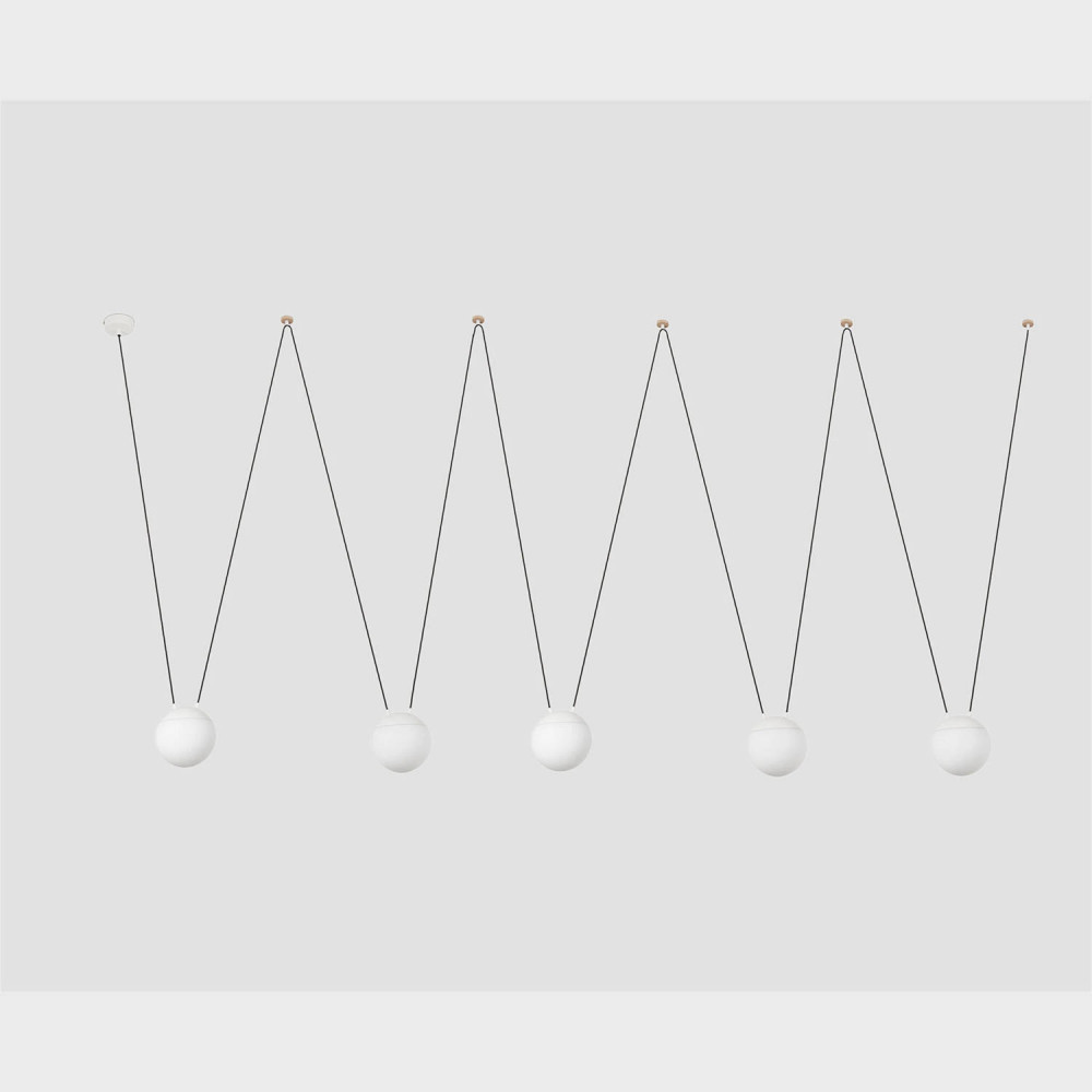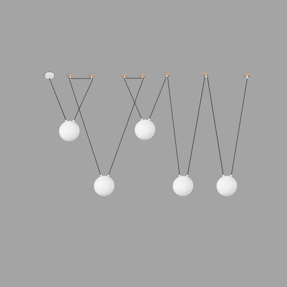 MINE GLASS Colgante blanco de cinco luces diseñado por Nahtrang con estructura de metal y difusor de cristal opal. El material y la luz que fluye a través del difusor aportan calidez y confort a tu hogar. Este colgante de diseño es versátil y personalizable, gracias al accesorio gancho, podrá colocar la luz donde la necesite. Por sus posibilidades es ideal para la iluminación de espacios contract, pero también para iluminar el hogar.