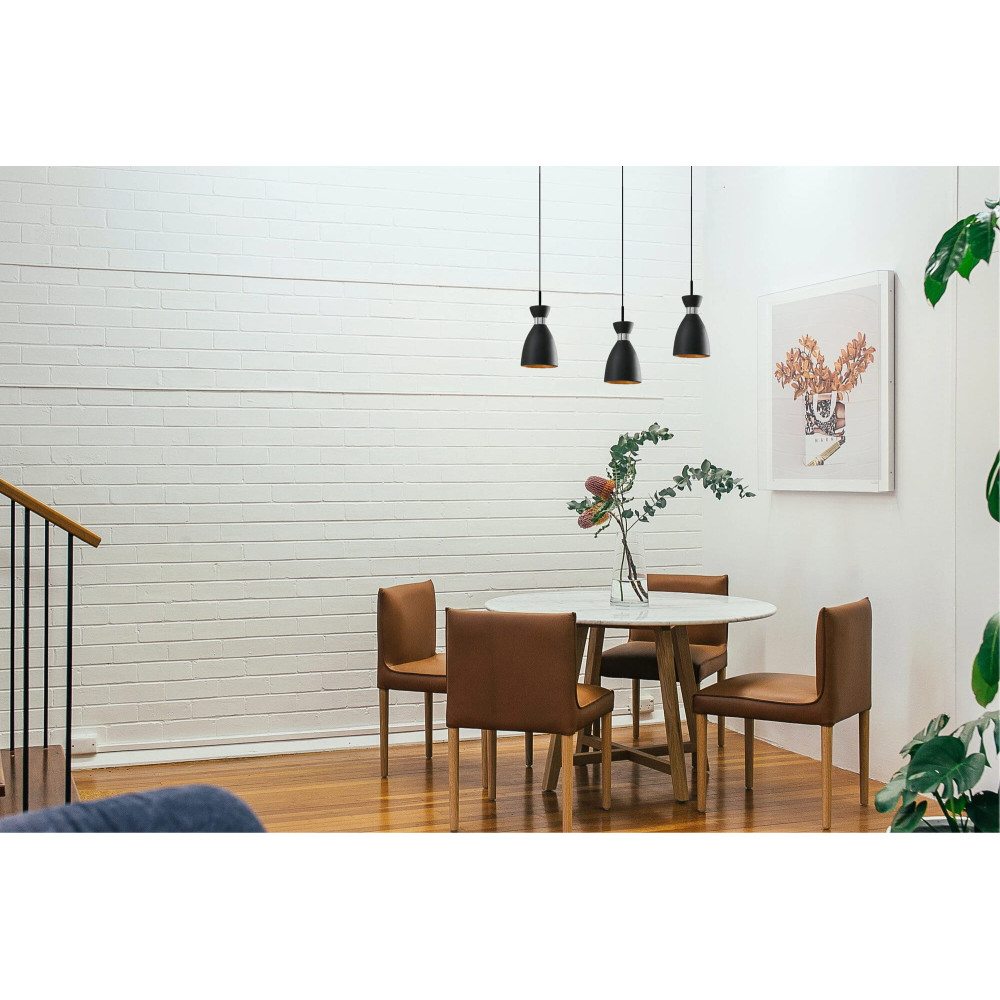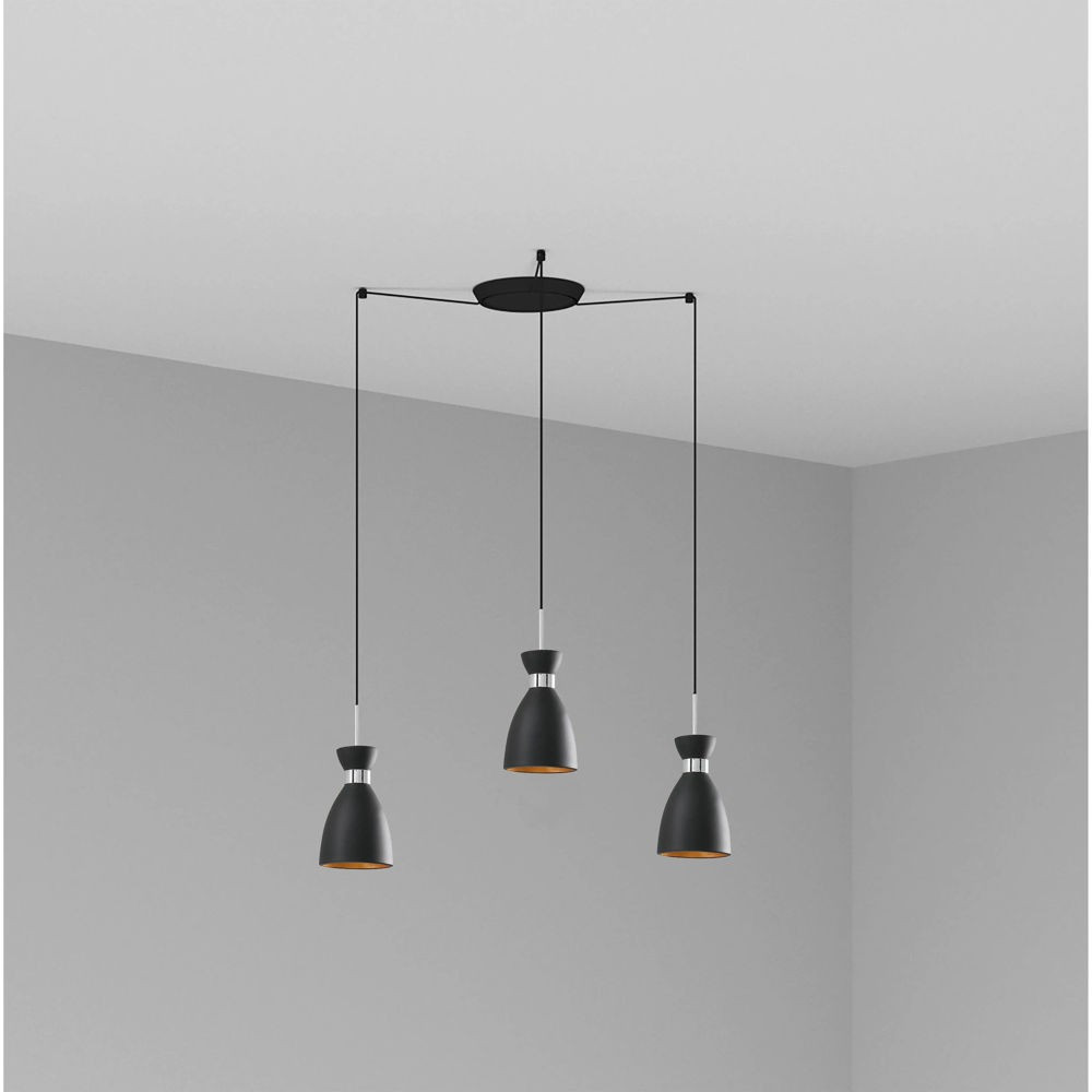 RETRO es una serie de lámparas de diseño de Alex & Manel Lluscà inspiradas en los años 60. Con esta lámpara colgante negra y cobre podrá iluminar diferentes ambientes de su hogar. Con esta serie conseguirá un aire retro para la iluminación del hogar. Versión con florón multiple de 3 luces.