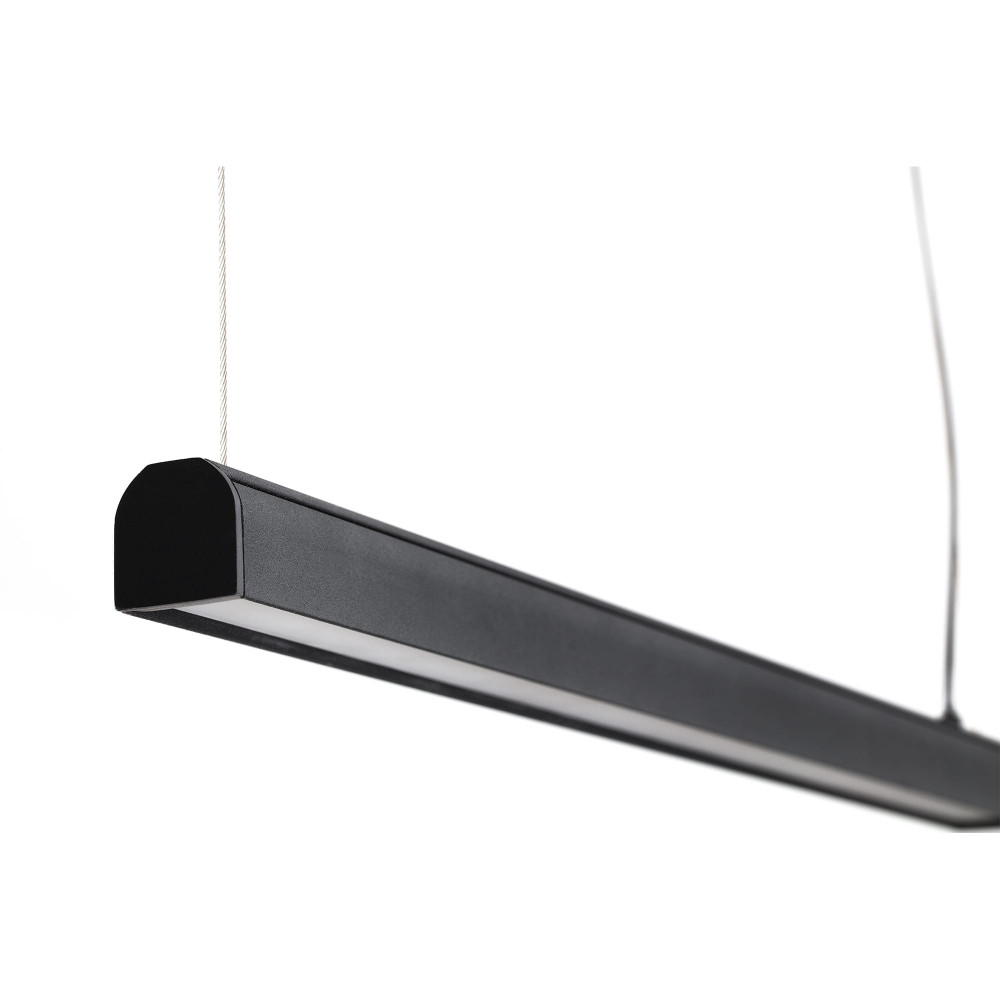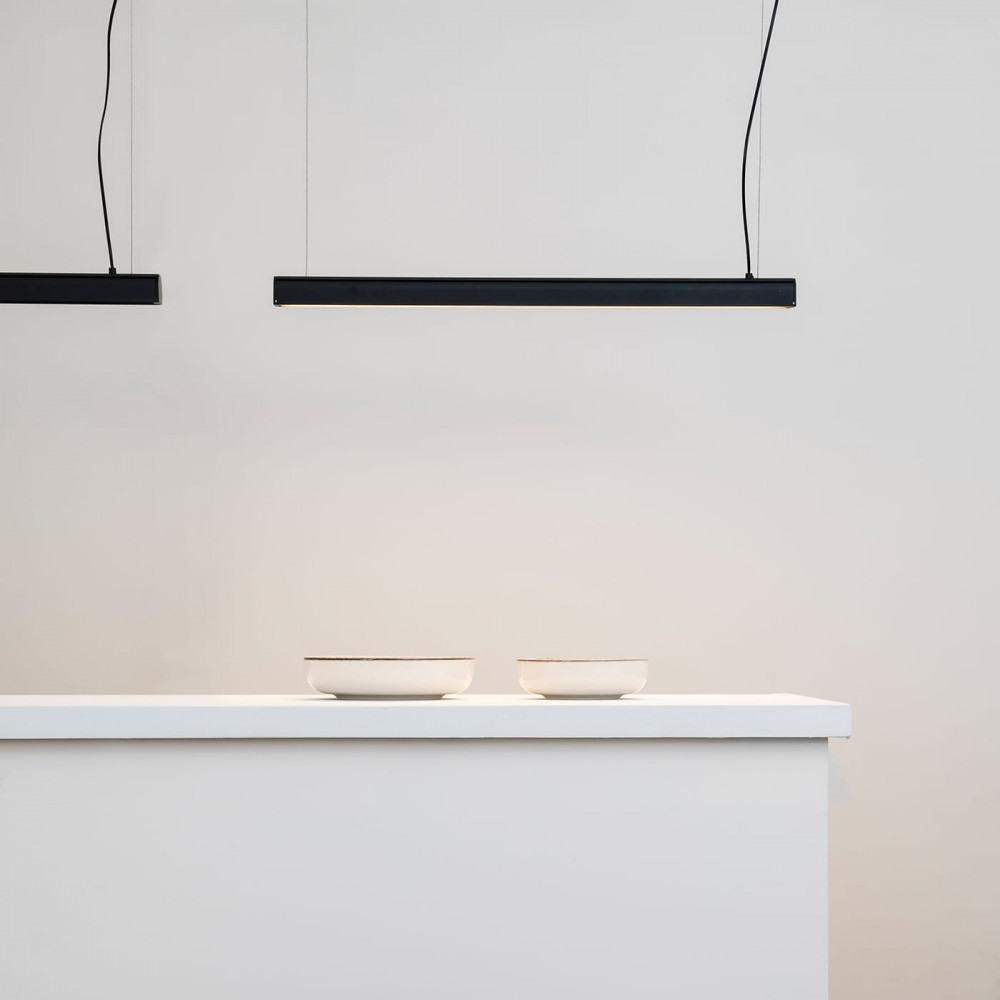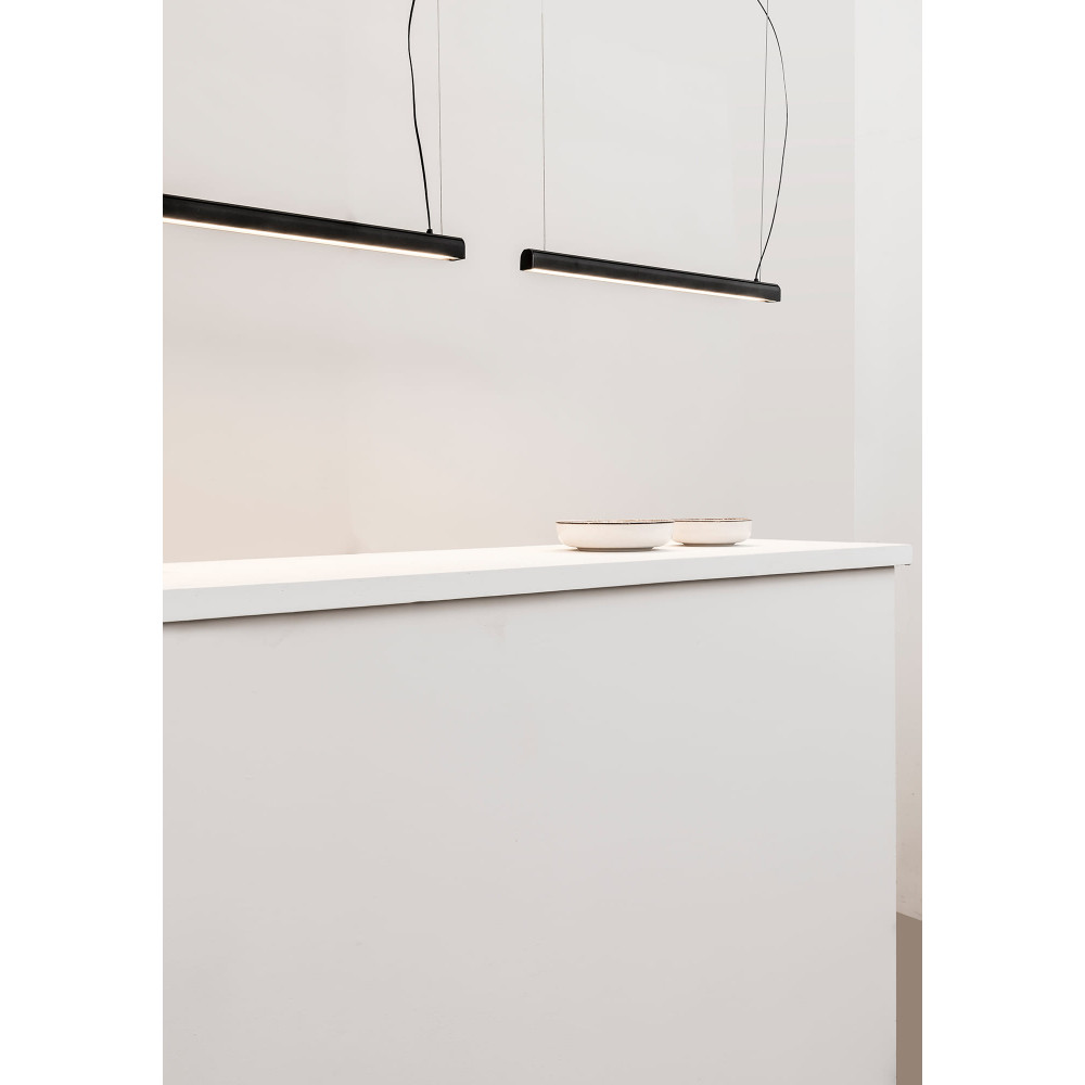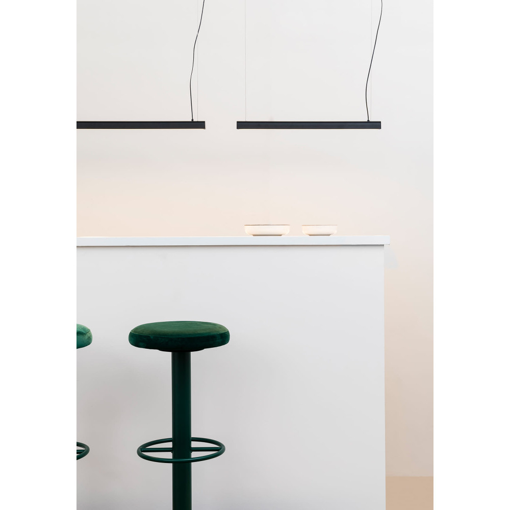 VICO es una lámpara colgante negra de estilo minimalista muy moderna. La colección permite escoger entre dos longitudes y entre dejar a la vista el florón o instalarlo como empotrable. Esta es la versión de 60cm con el florón empotrable. Ideal para todo tipo de espacios interiores como comedores.