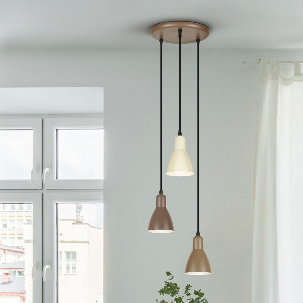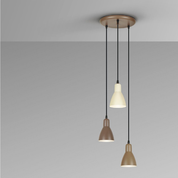 Colgante de 3 luces fabricado en metal y tres acabados: marrón, marrón oscuro y crema satinado. Regulable en altura hasta un máximo de 2100mm. Admite tres bombillas E27 (No incluidas).