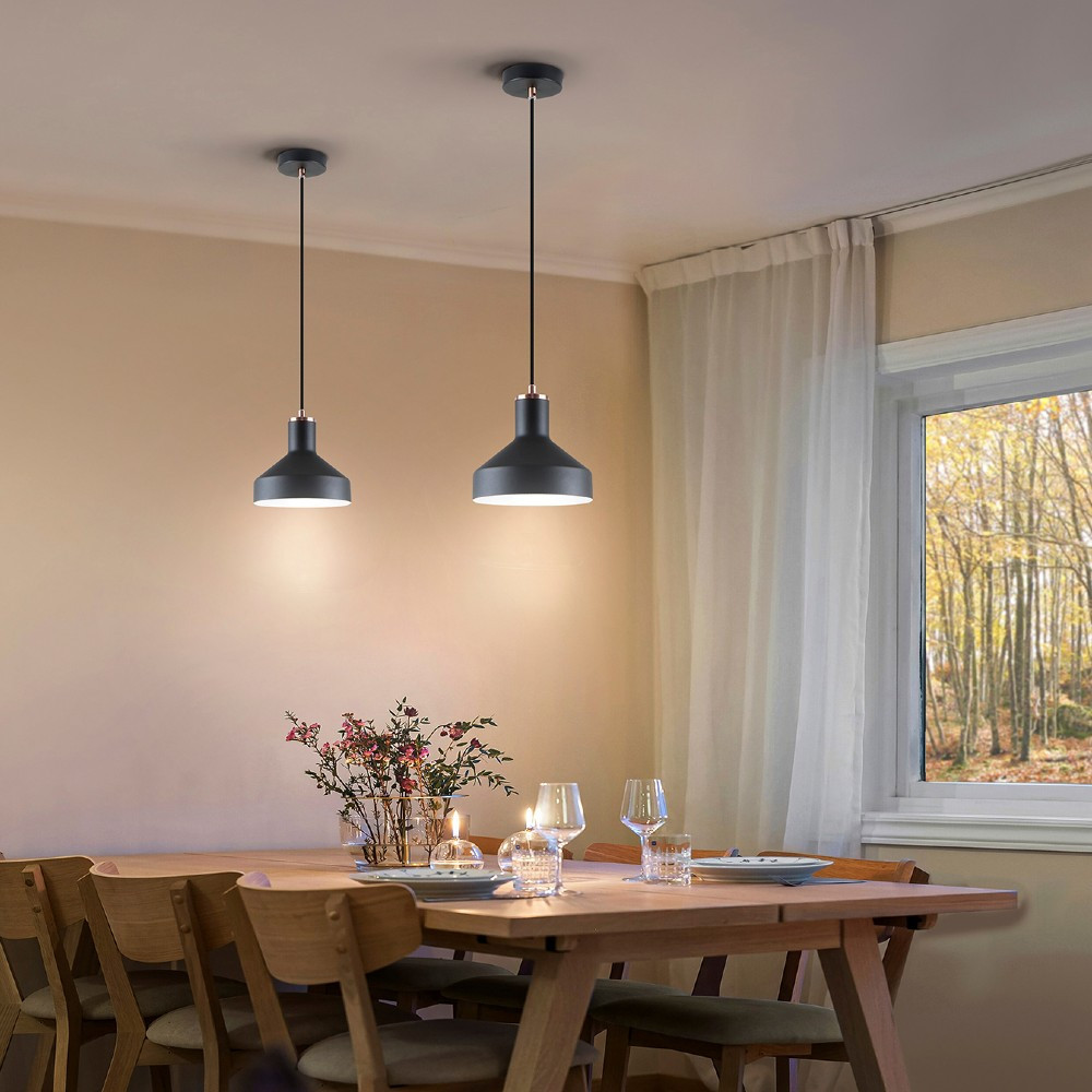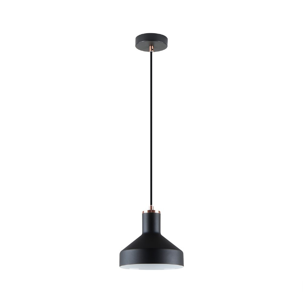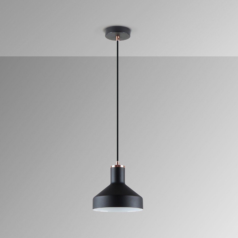 Colgante de una luz fabricado en metal acabado negro mate y detalles en cobre satinado. Regulable en altura hasta un máximo de 1410 mm. Admite una bombilla E27 LED (no incluida).