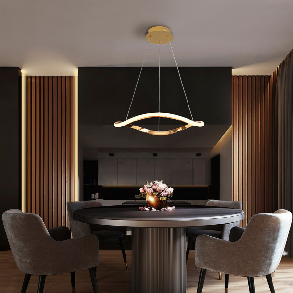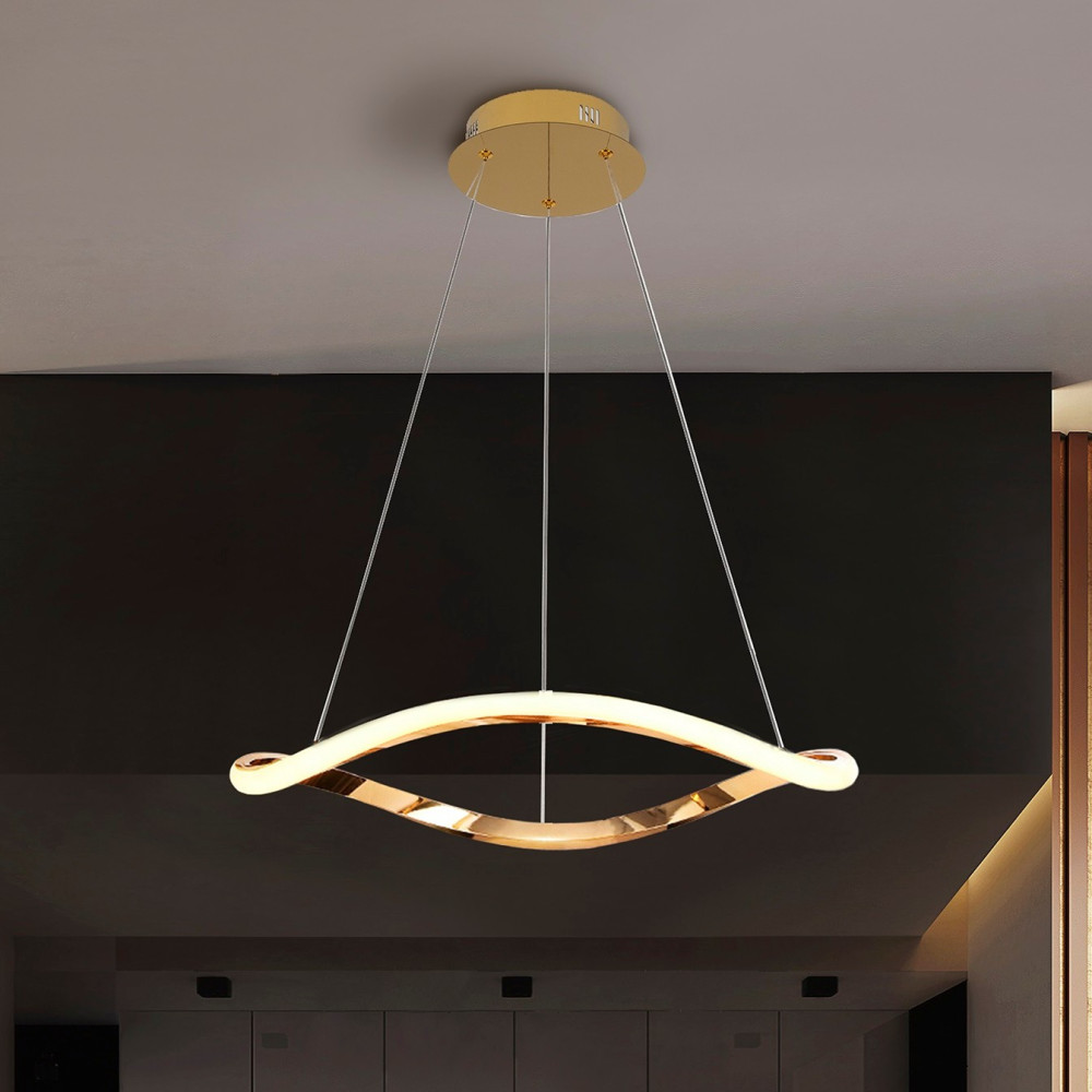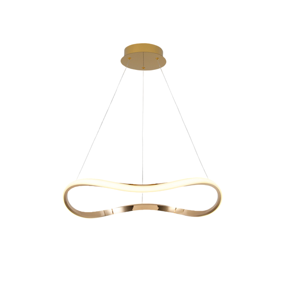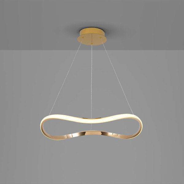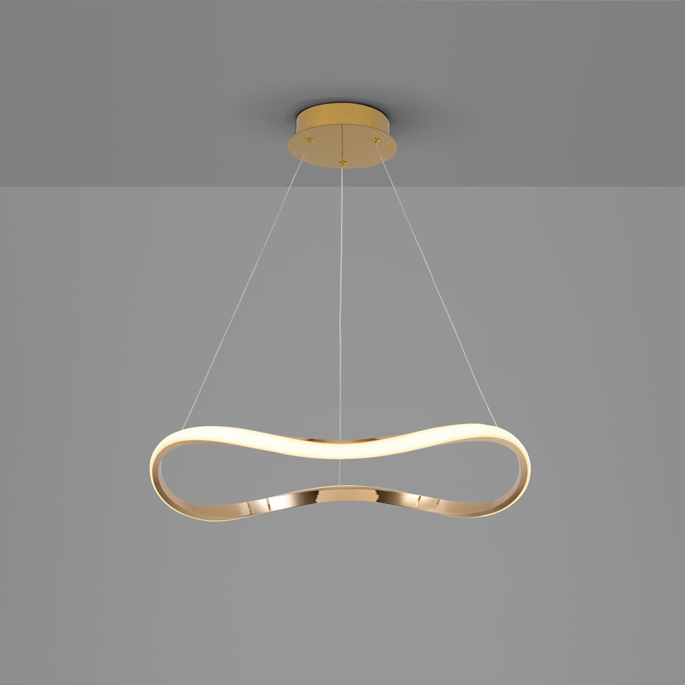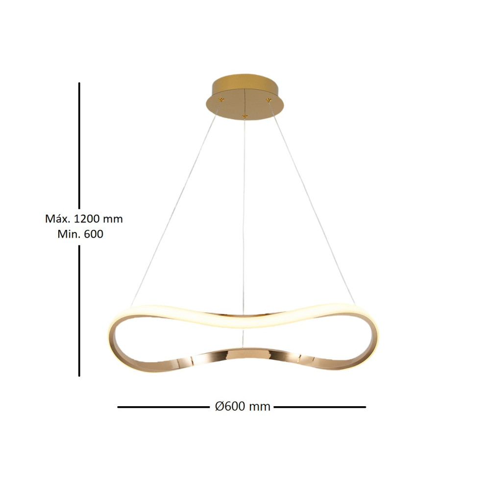 Lampara de un aro curvado. Realizada en metal y aluminio. Acabado oro rosa brillo. Difusor de silicona opal. Altura regulable. 27W LED, 1.600 l, 3.000K