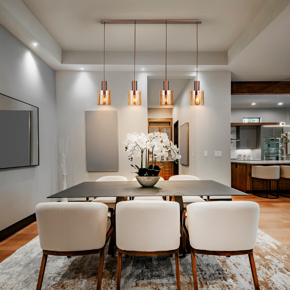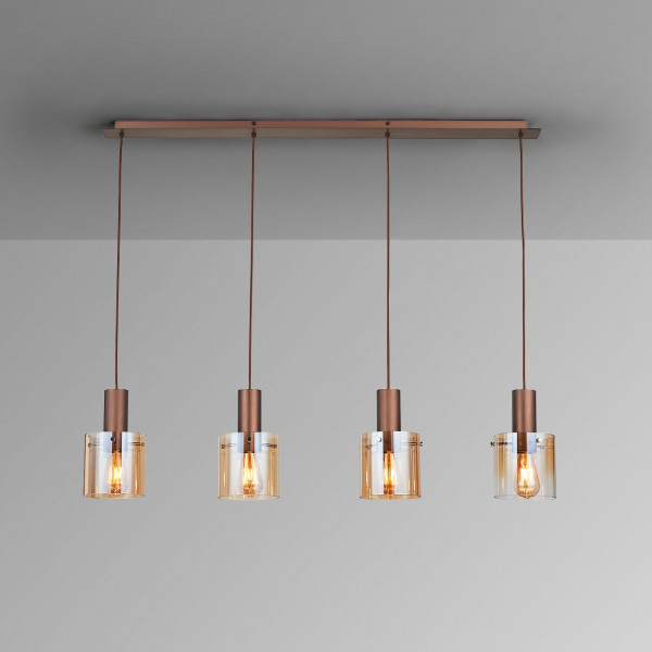 Colgante acabado en cobre satinado y tulipa en cristal ambar. 4 E27 LED no incluidas.
