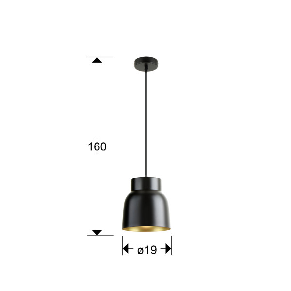 Colgante realizado en metal acabado negro mate e interior oro. Florón fabricado en metal acabado negro mate. Regulable en altura hasta un máximo de 1900 mm. Admite bombilla E27 LED (no incluida).