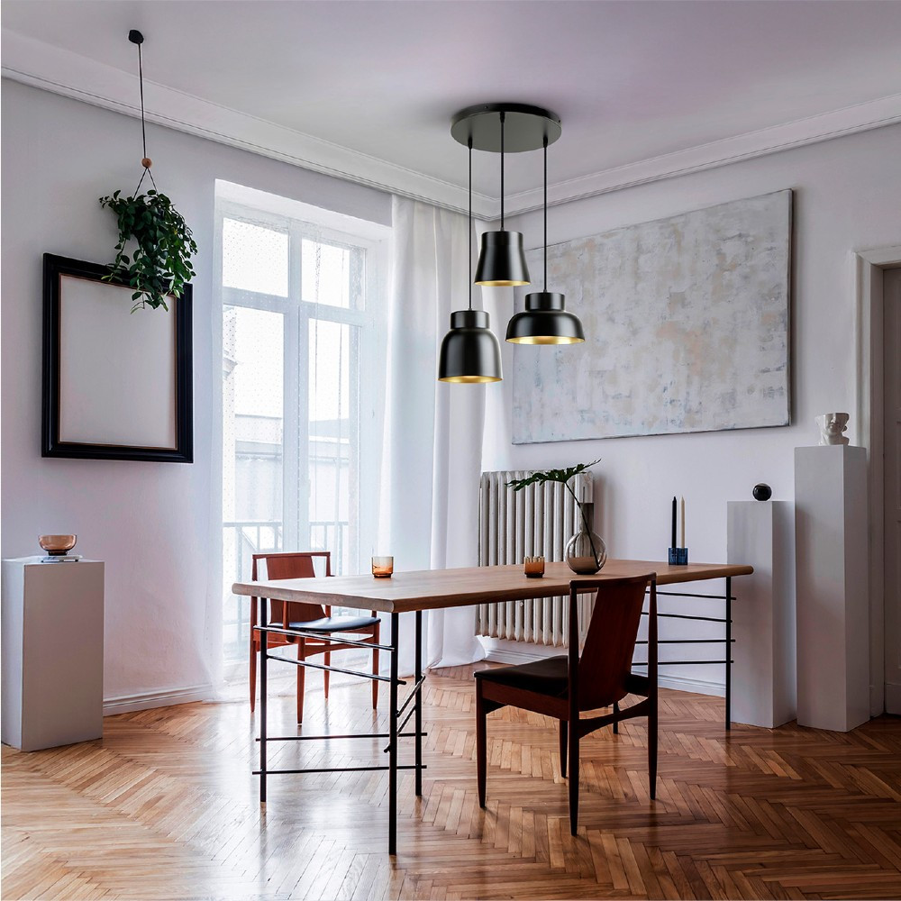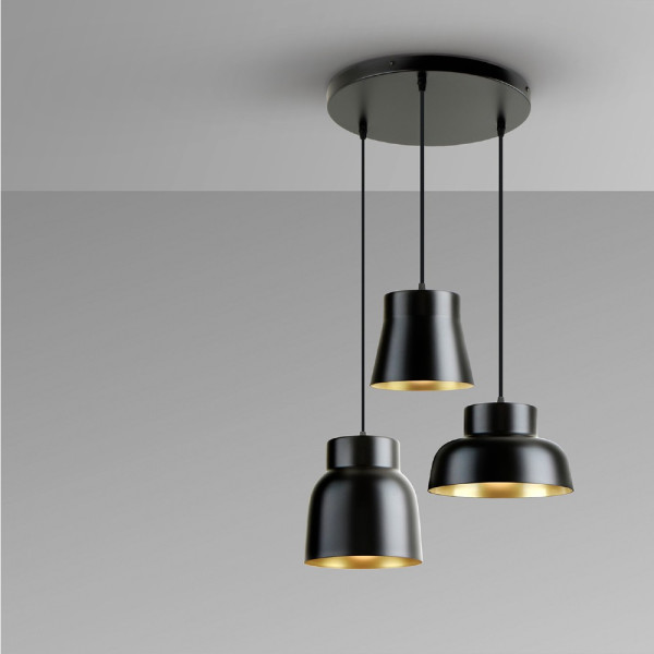 Colgante acabado en negro mate de 3 luces y oro 3 E27 LED no incluidas.