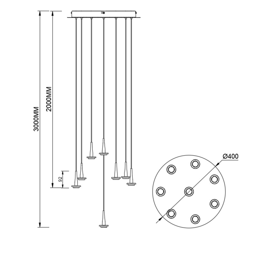 Incorpora tecnología LED integrada de 40W, ofreciendo una iluminación cálida de 3000K con un flujo luminoso de 4000 lúmenes, ideal para crear ambientes acogedores en salones, comedores o dormitorios. Su altura ajustable hasta 300 cm permite adaptarla fácilmente a diferentes alturas de techo y necesidades decorativas.