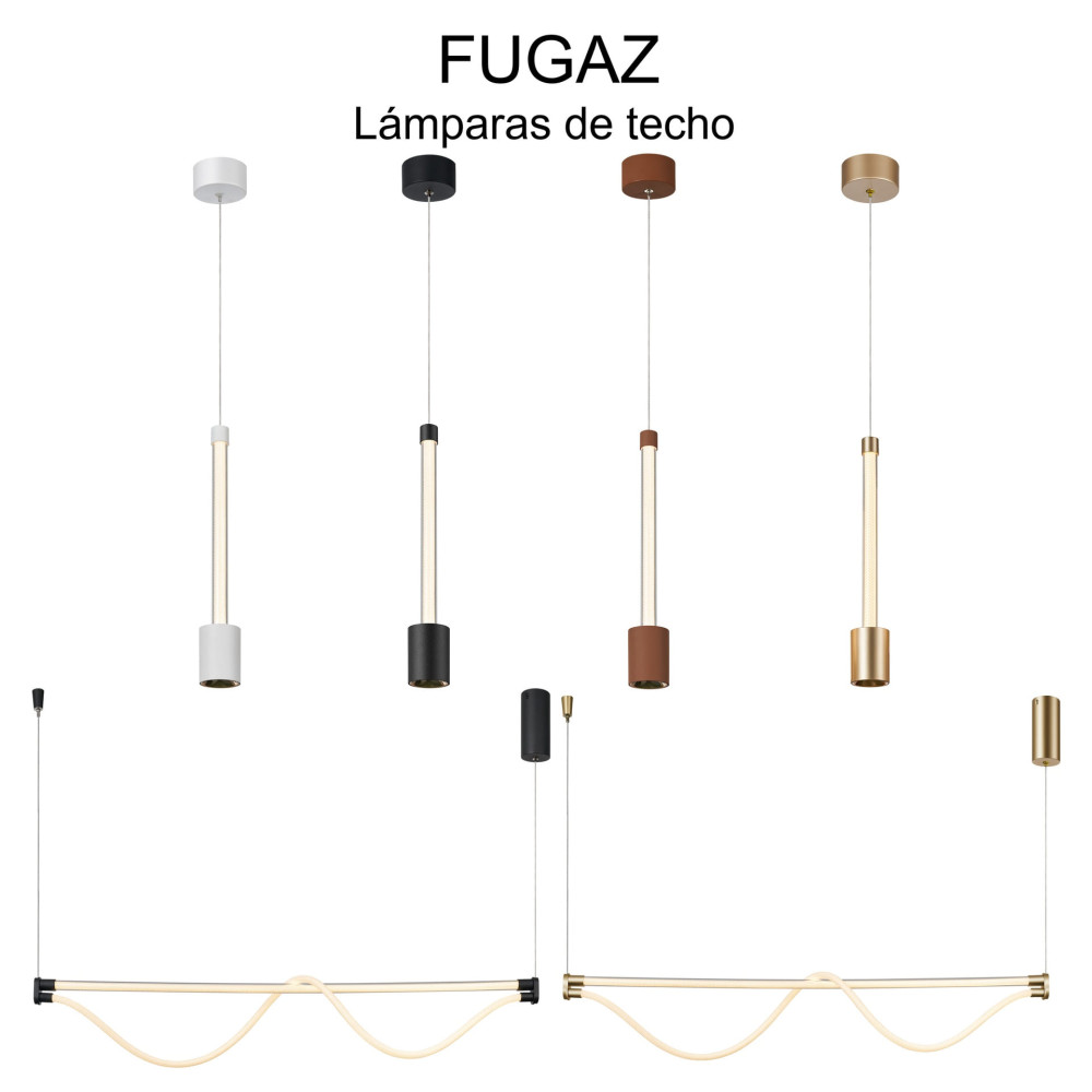 Los modelos lineales destacan por su manguera flexible de silicona con tira LED integrada, ofreciendo iluminación moderna y versátil. Disponible en cuatro acabados: blanco, negro, camel y oro, Fugaz aporta un toque de estilo y sofisticación a cualquier ambiente.