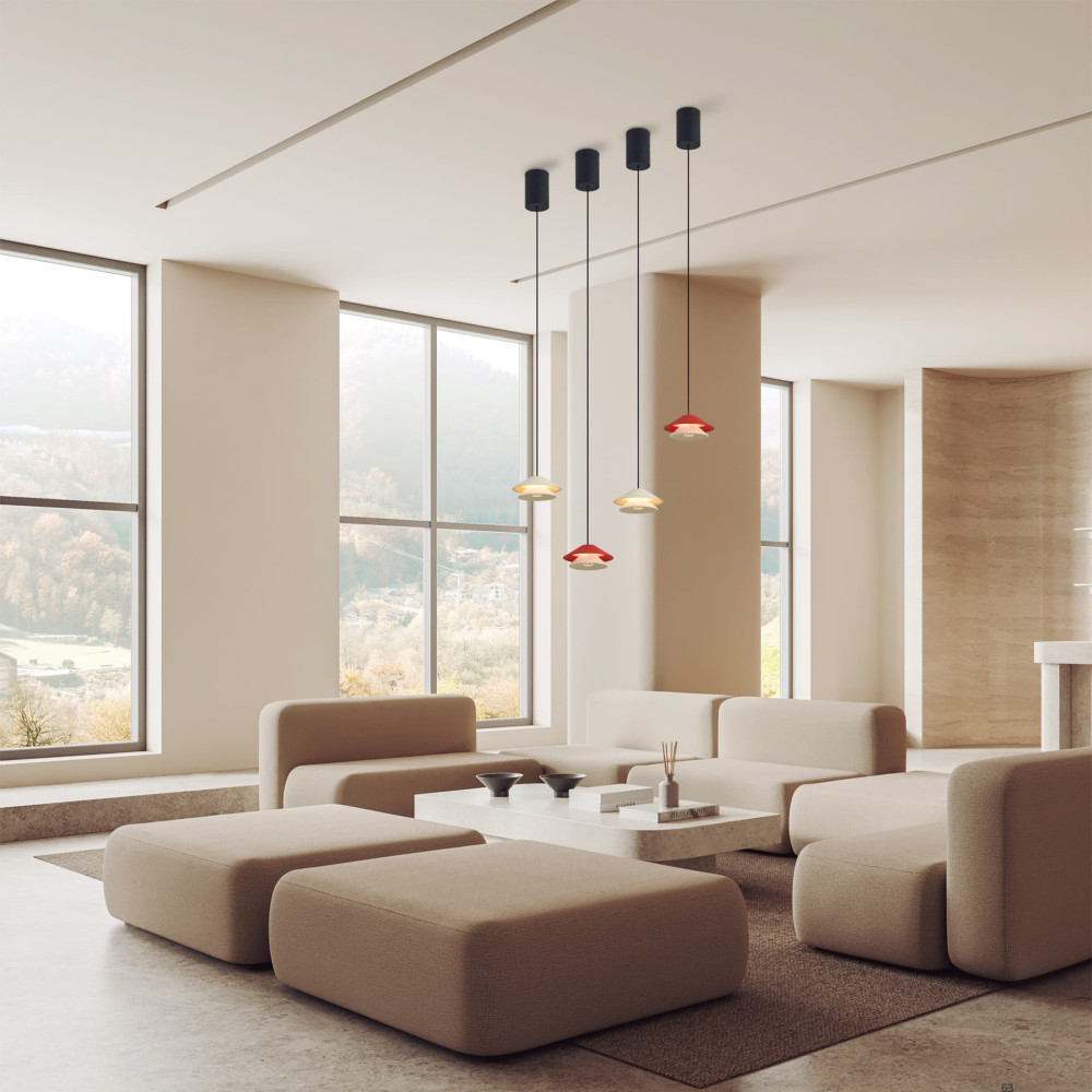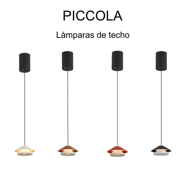 Colgante LED de la colección Piccola de Mantra Iluminación. Diseño minimalista con difusor de doble cono y acabado en varios colores (blanco, marrón, naranja, negro). Incorpora sistema sube y baja para ajustar la altura sin herramientas.
