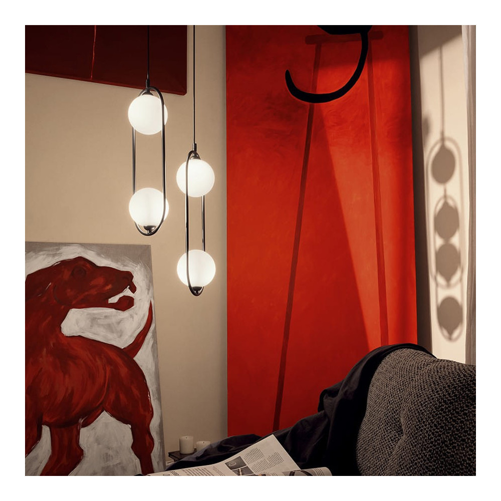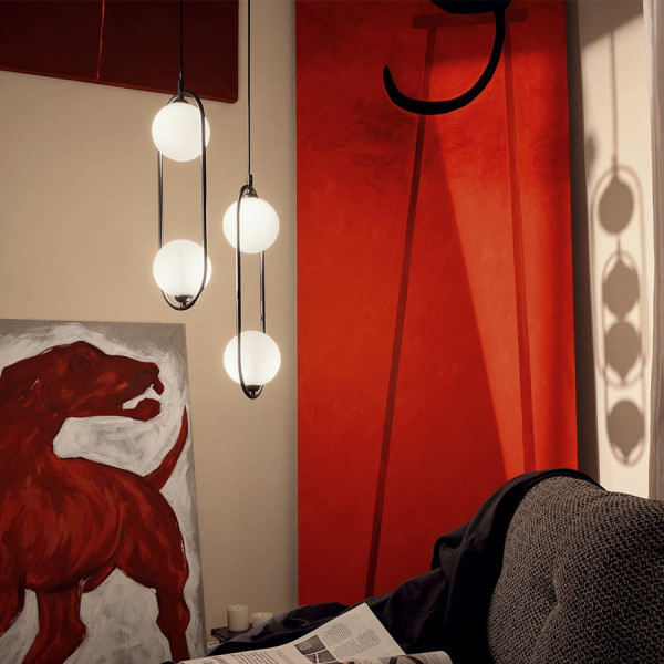 Accesorios metálicos en tres acabados: blanco, negro y latón. Las pantallas esféricas están fijadas sobre una estructura metálica redondeada.