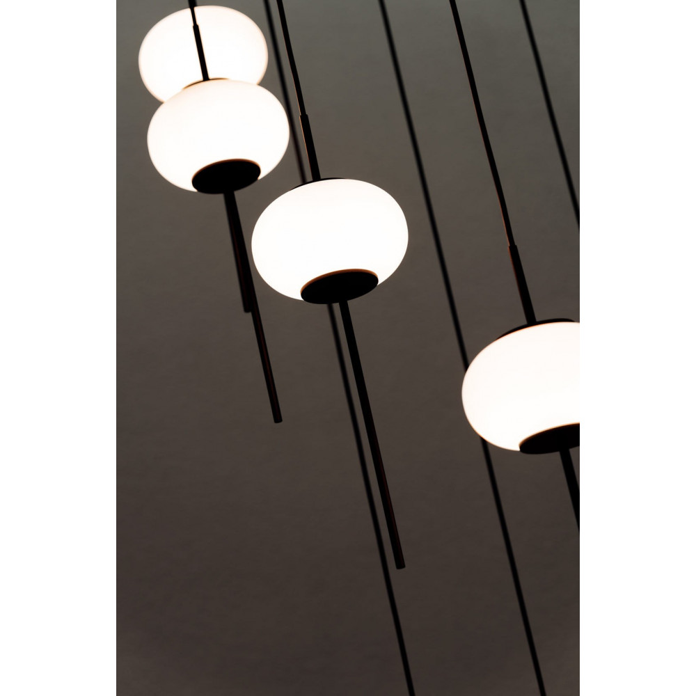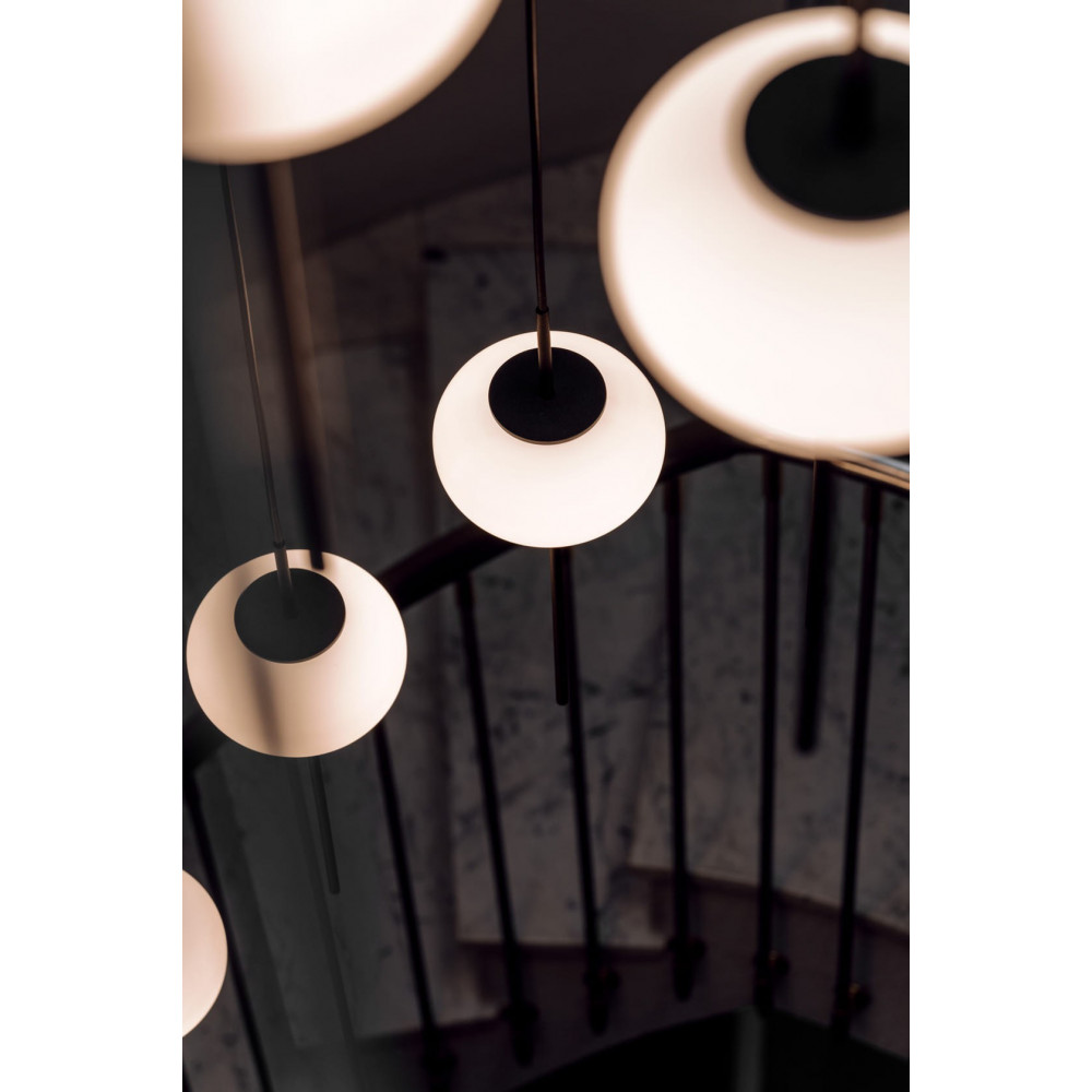 Lámpara colgante fabricada en acero lacado negro mate con pantalla difusora en vidrio soplado. Funciona con dos bombillas G9, no incluidas.