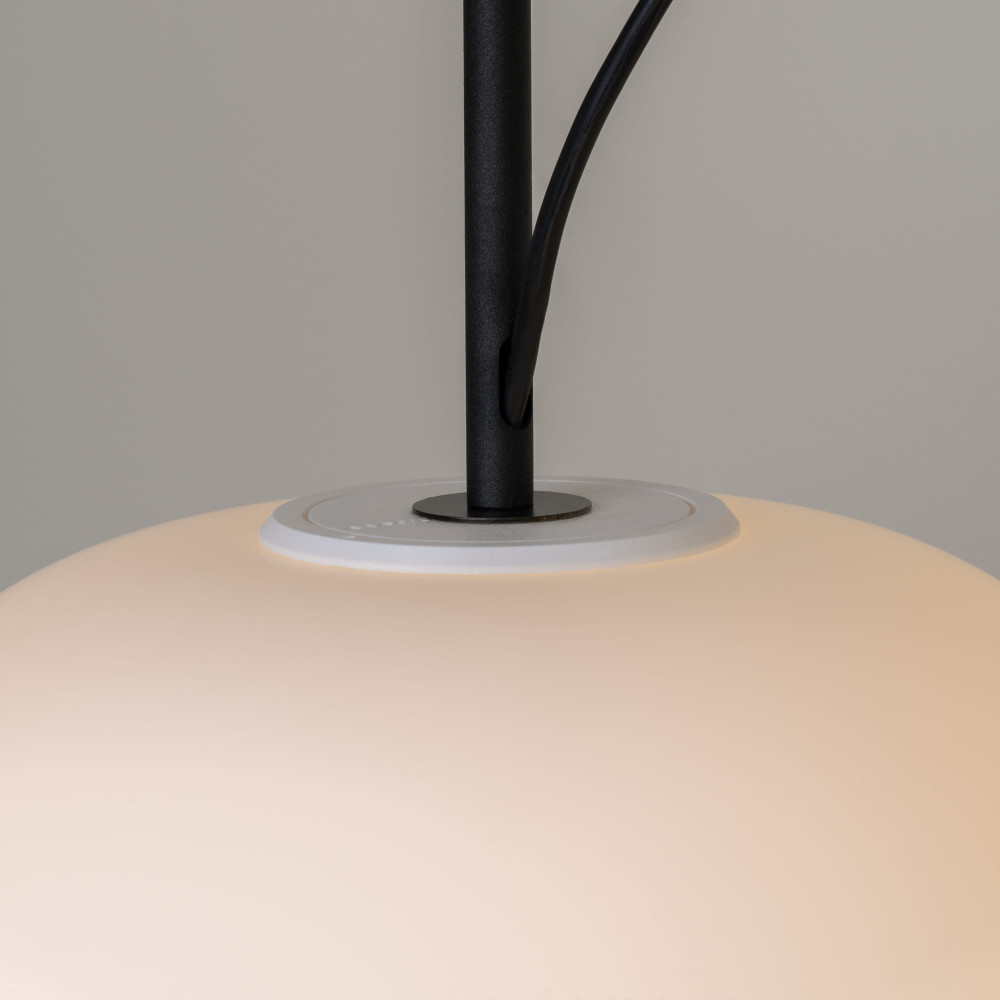 Lámpara colgante con cuerpo metálico negro mate y difusor de cristal soplado.