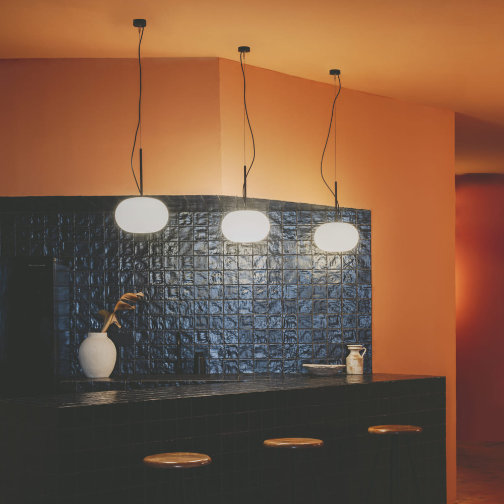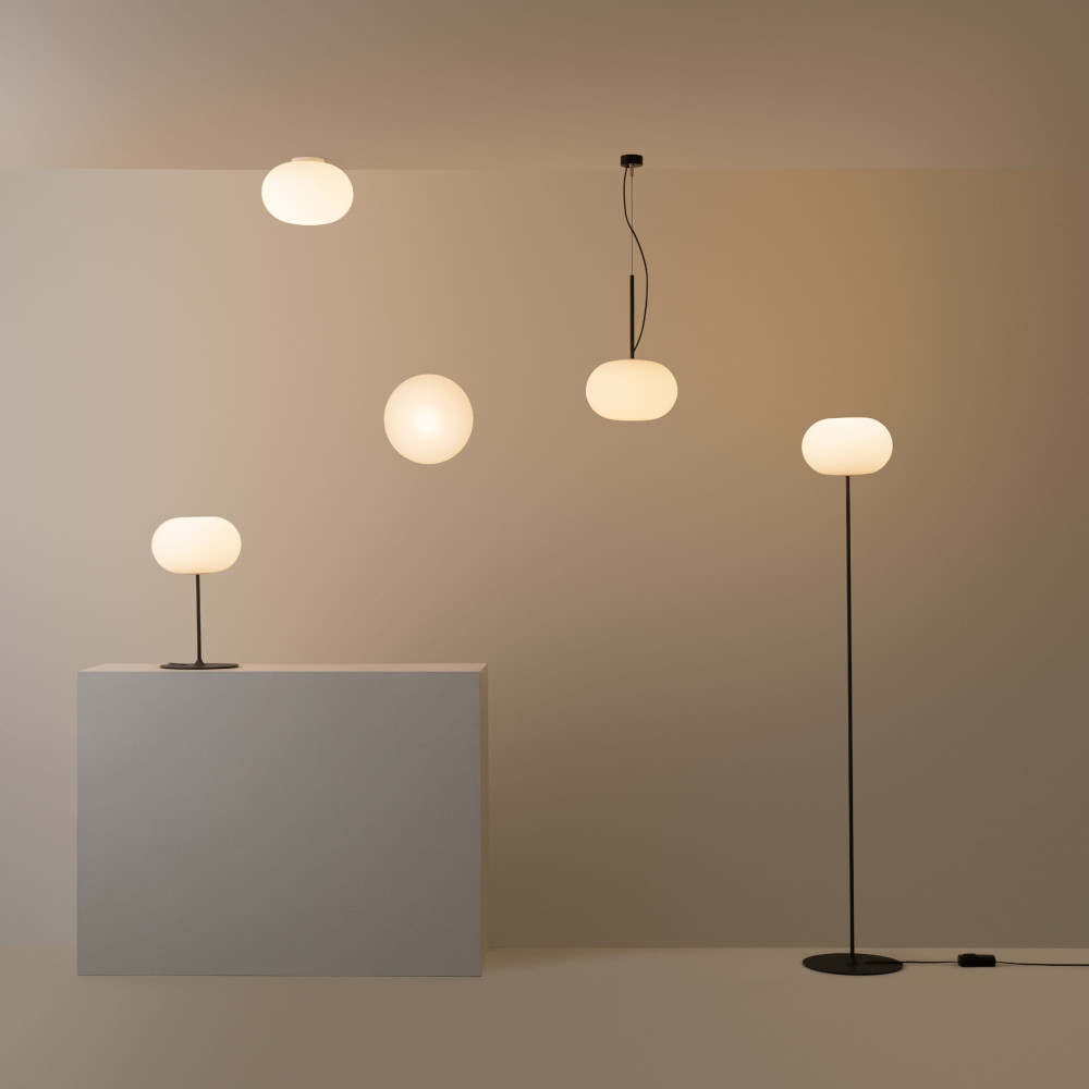 En la fragilidad de la distancia de principio al fin, es donde nace esta serie característica tanto por su forma esférica infinita como por el uso del cristal soplado que la dota de una sutil y firme delicadeza. Su exquisitez, los materiales que la componen y todas las versiones existentes, hacen que sea una colección perfecta para el uso en espacios de contract. La colección esta disponible en cuatro versiones distintas, que articuladas entre ellas aportan ritmo y carácter al espacio; un pie de salón, un sobremesa, un aplique o plafón y un colgante. La colección esta disponible en color negro lo que la también la hace ideal para cualquier rincón del hábitat.