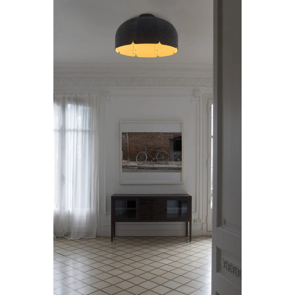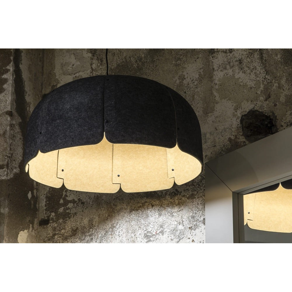 MUTE es una lámpara colgante de diseño creada por Nahtrang. La pantalla de la versión en marrón y gris oscuro reduce la reminiscencia del sonido por lo que es ideal para iluminar restaurantes o espacios con ruido. Está formada por 8 piezas de hojas y cada hoja está compuesta por 2 capas de material acústico. Está fabricada con un 65-70% de botellas recicladas y un 30-35% de fibras libres de P.E.T.