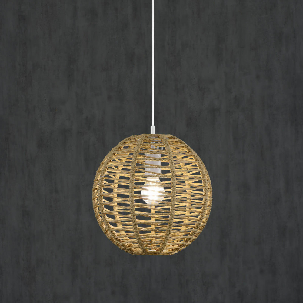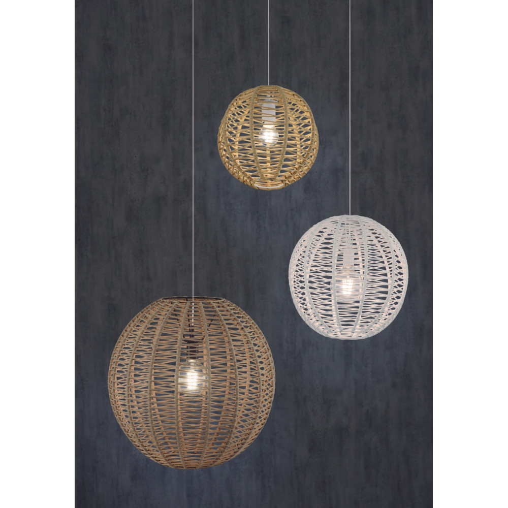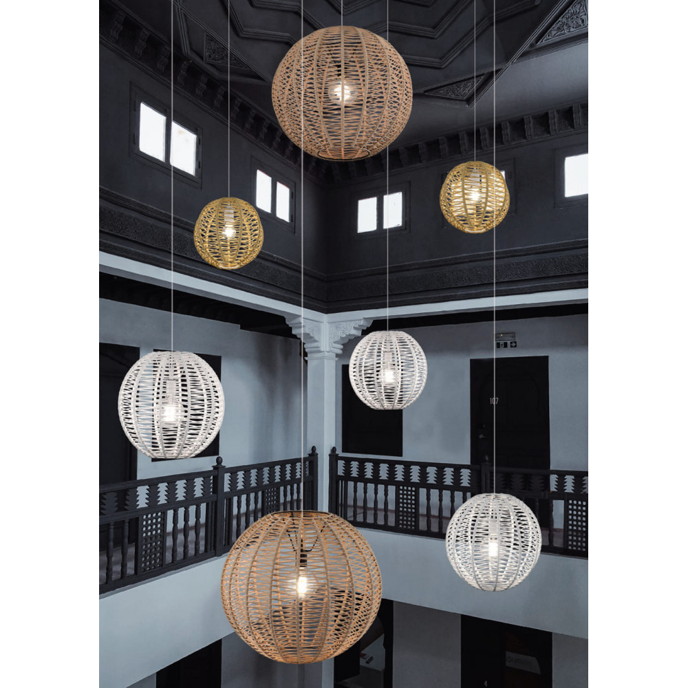 Modelo esférico con un nuevo diseño de trenzado artesanal en zig-zag sobre estructura metálica. Proporciona un impacto visual único y novedoso. Colección sostenible con cuerda fabricada con botellas de plástico reciclada.