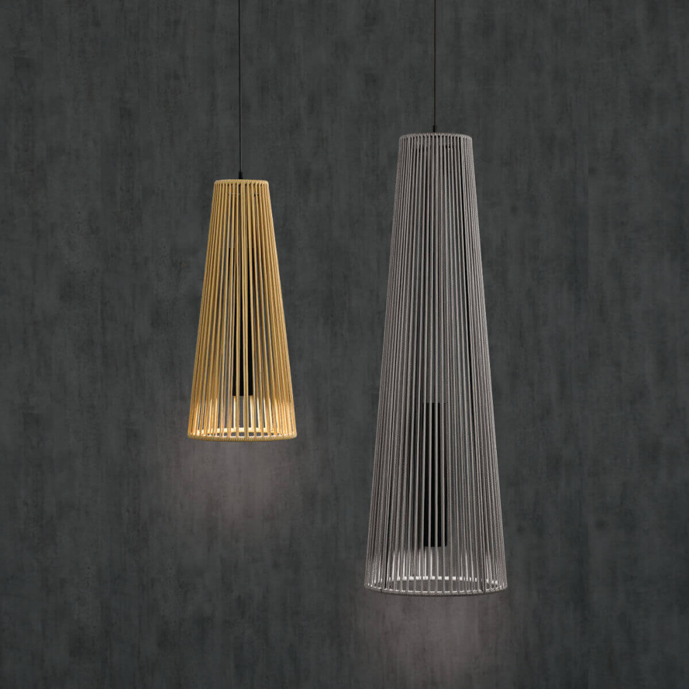 Sencillo diseño de cuerda trenzada artesanalmente sobre una estructura metálica de forma cónica. La instalación interior se basa en uno de nuestros focos PEPO para marcar mejor el cono de luz.