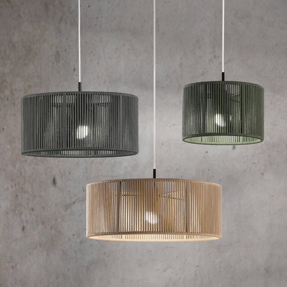 Colgantes con pantalla de cuerda de estructura cilíndrica y con una amplia gama de colores que proyectan la luz con estilo. Disponible como colgante individual o como colgante rígido de tres brazos del que florecen tres pantallas de distintos tamaños.