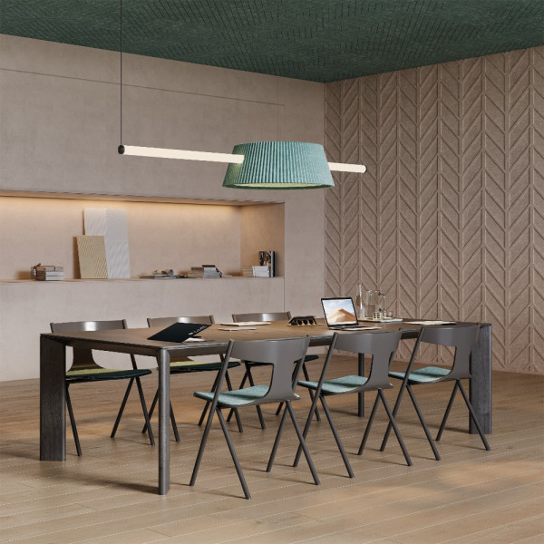 Al combinar un material acústico con una luminaria en línea, este diseño de Rafa Ortega crea una atmósfera que invita a la contemplación. Nos recuerda como el sonido y el silencio afectan nuestras interacciones y conexiones humanas, haciéndonos reflexionar sobre la importancia de la comunicación y la escucha en nuestras relaciones.