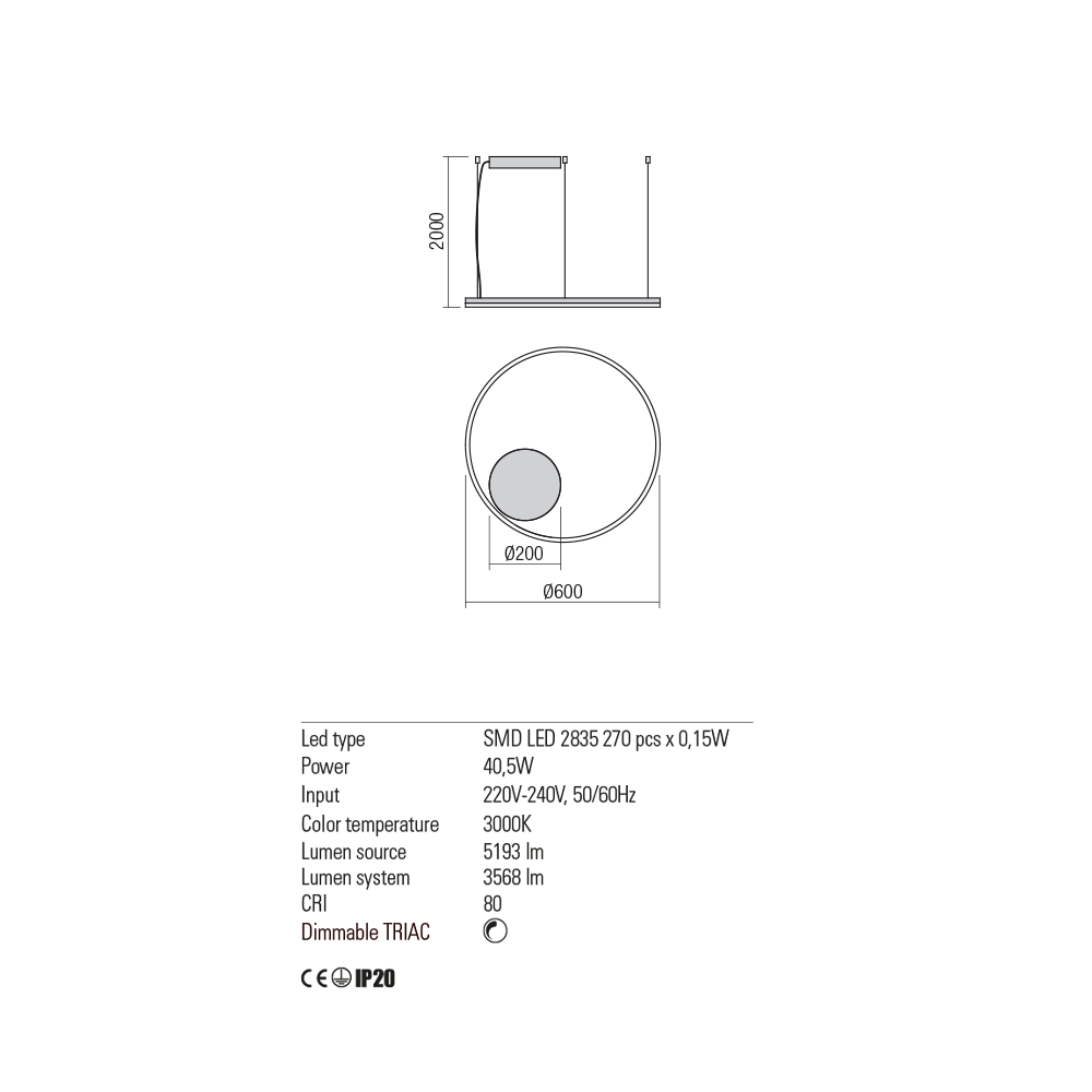 Colgante LED blanco arena de Ø600 regulable por TRIAC. LED 40,5W 3000K.