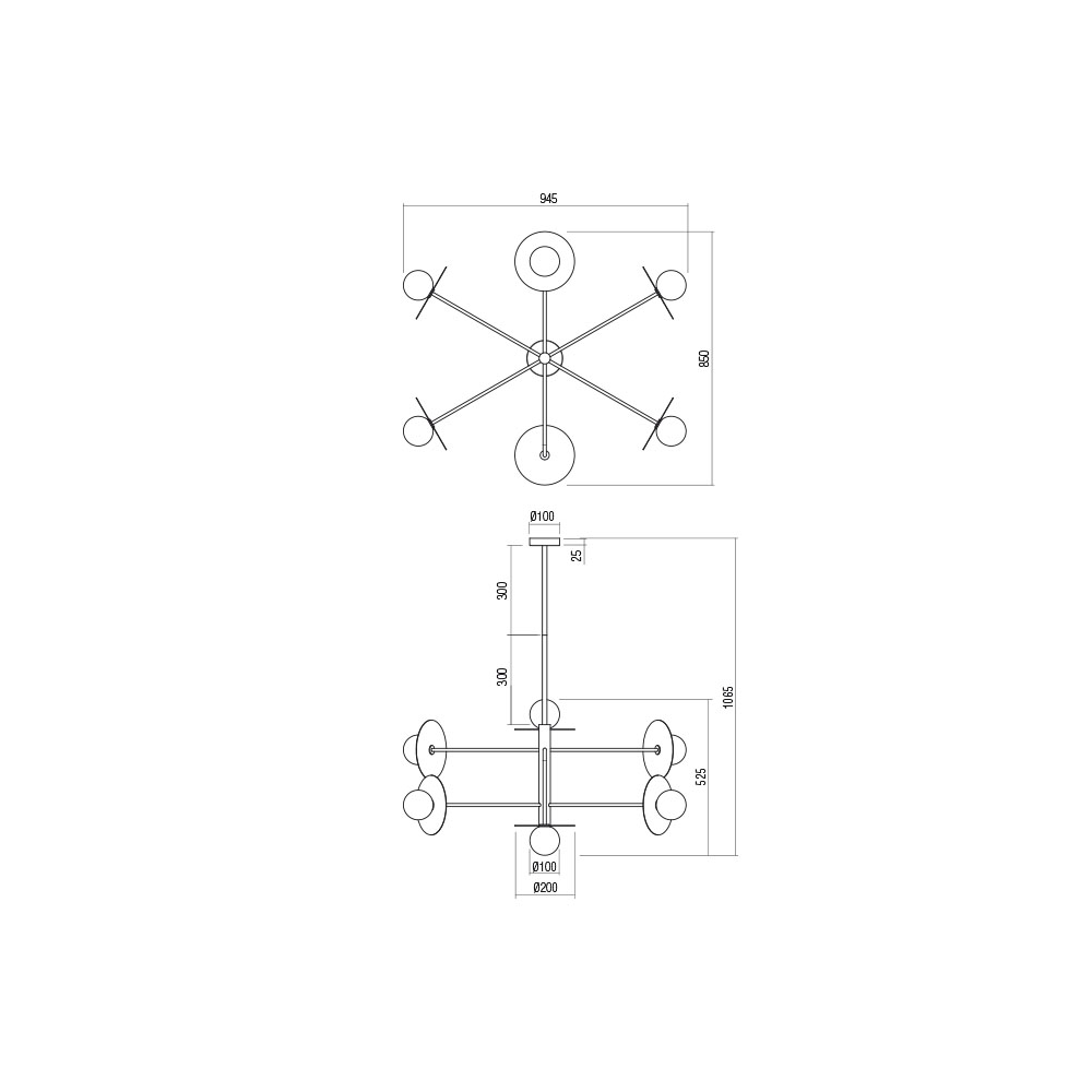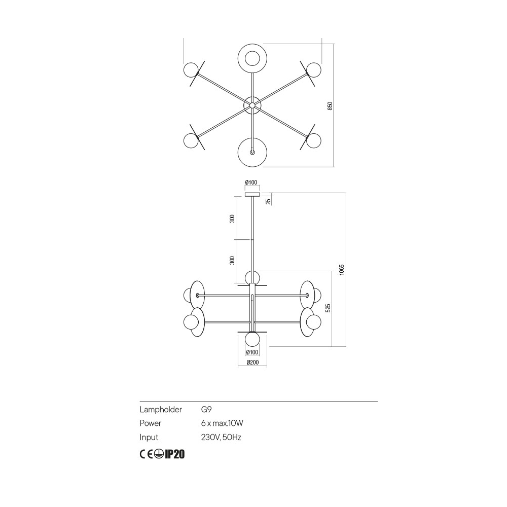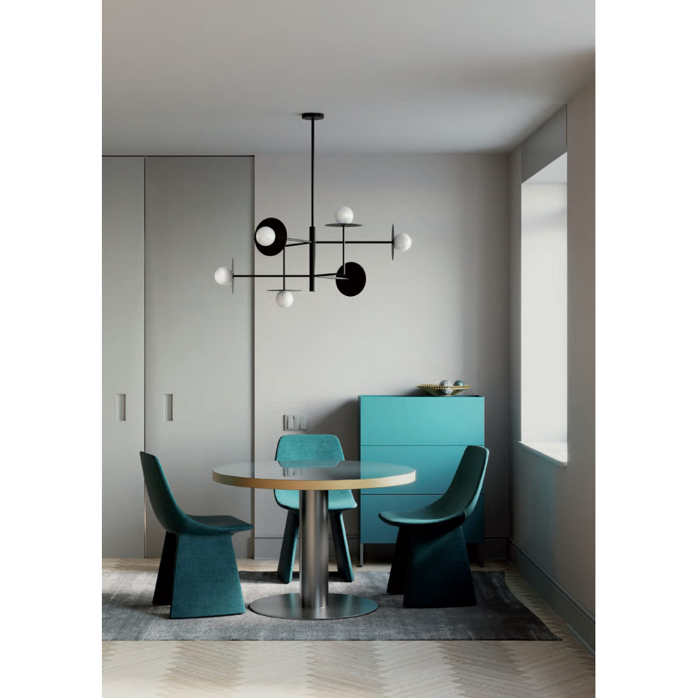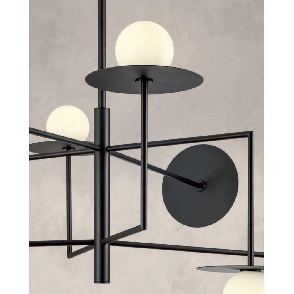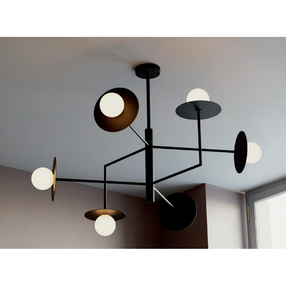 Suspensión interior, estructura de metal pintado negro mate, difusores de cristal soplado opal.