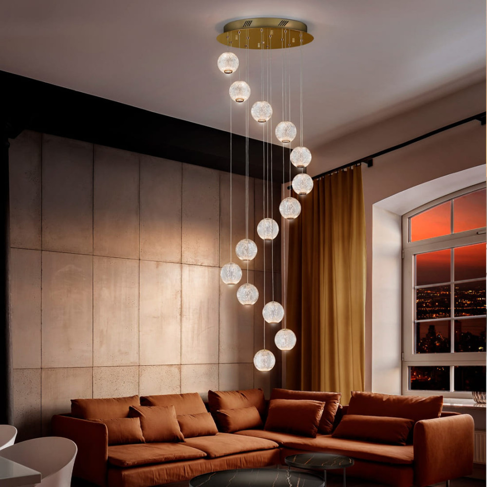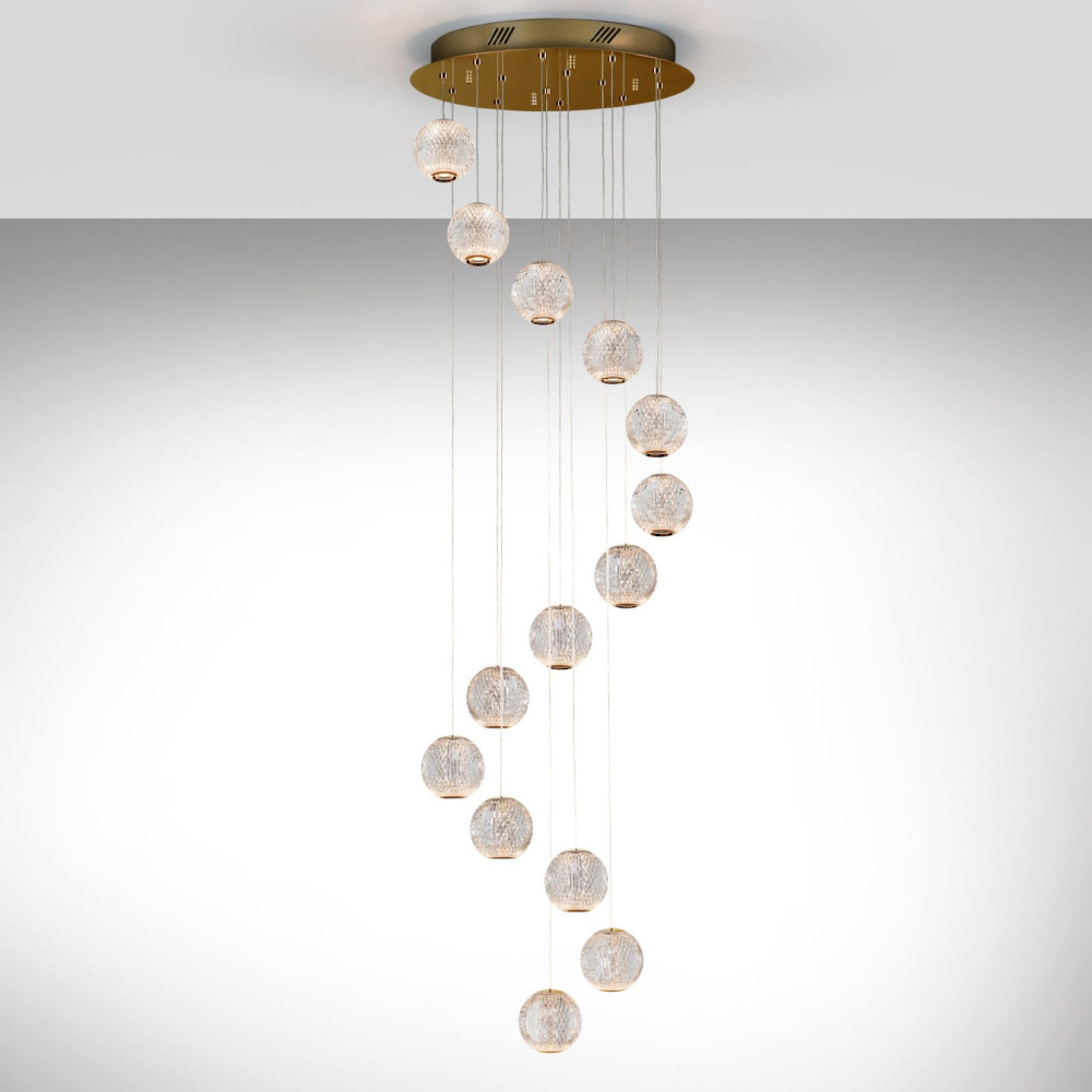Lámpara AUSTRAL redonda de 14 luces LED, metal acabado oro. Tulipas esféricas de Ø 11cm de acrílico óptico transparente, diseño facetado. 69W LED. 3.200K, 3.745 lm.