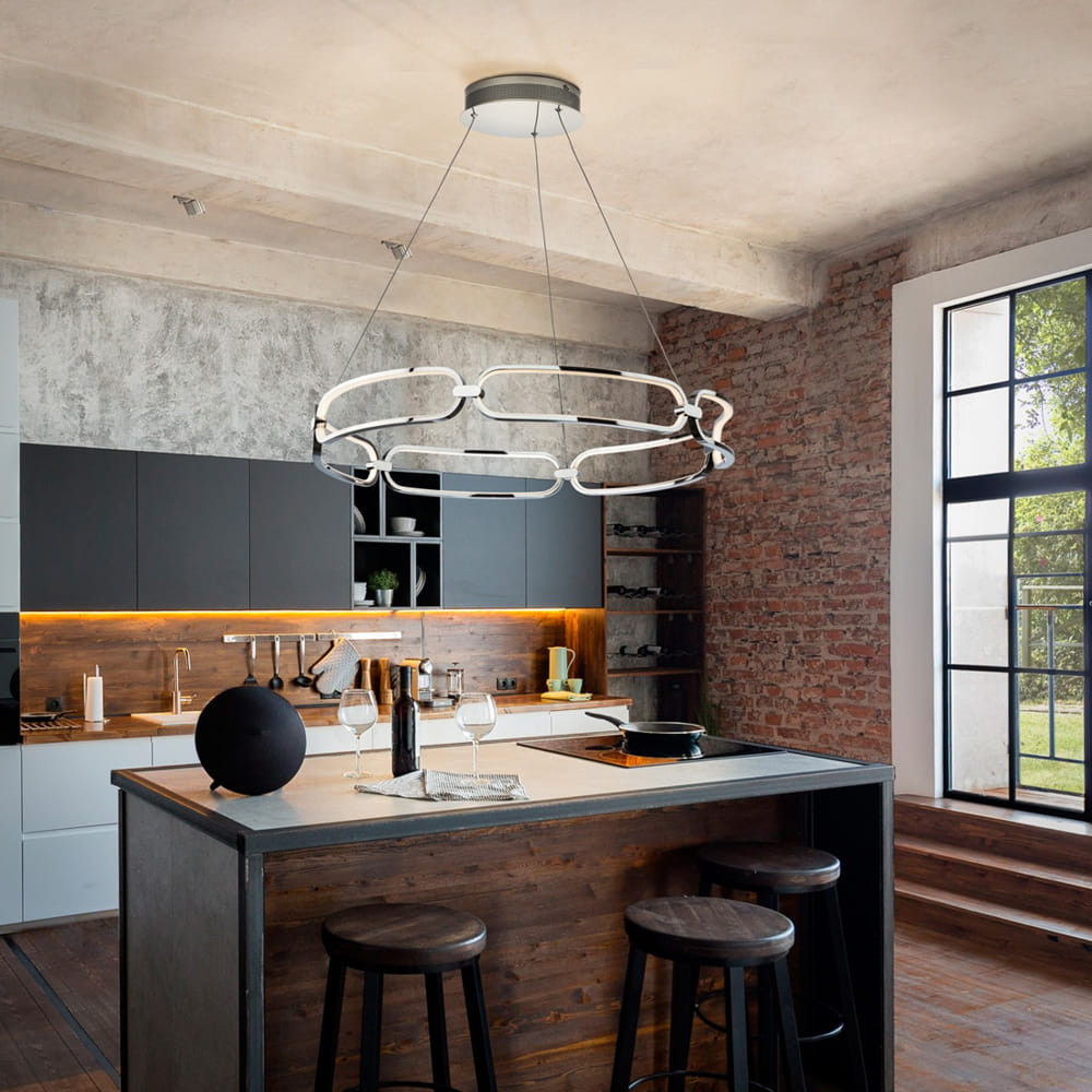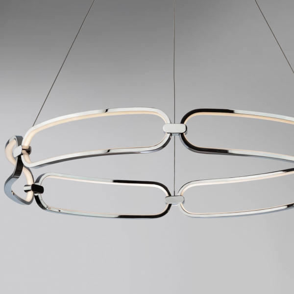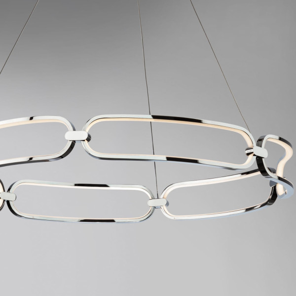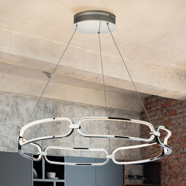 Lámpara COLETTE LED grande, realizada en aluminio acabado cromo. Difusores de silicona opal. Regulable en altura. 65W LED, 5.850 lm, 3.000 K. DIMABLE. Incluye mando a distancia.