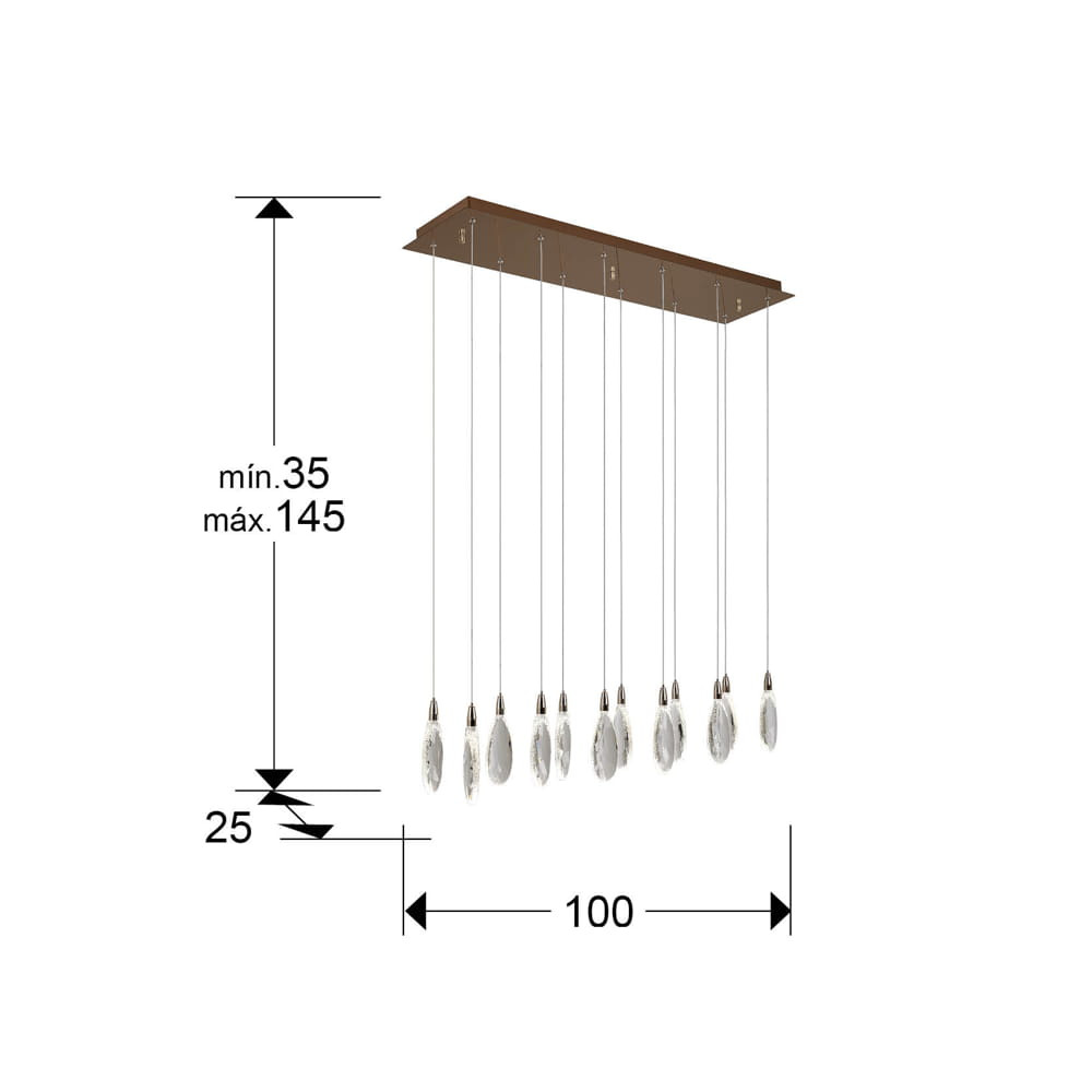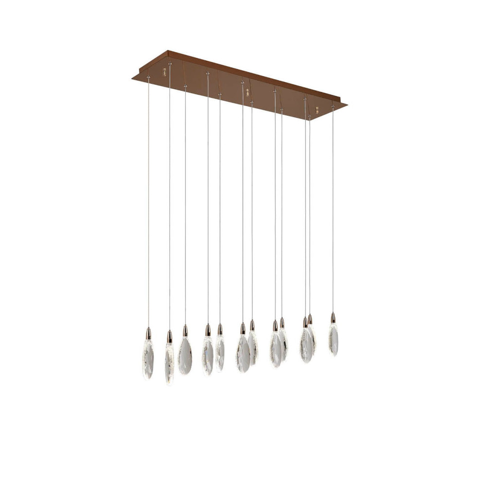 Lámpara rectangular realizada en acero y metal, acabado oro rosa. 12 luces con lágrimas de cristal tallado con bordes craquelados. Regulable en altura. Iluminación LED 24W, CCT: 2700-6000 K, 2.400 lm, DIMABLE. Incluye mando a distancia.